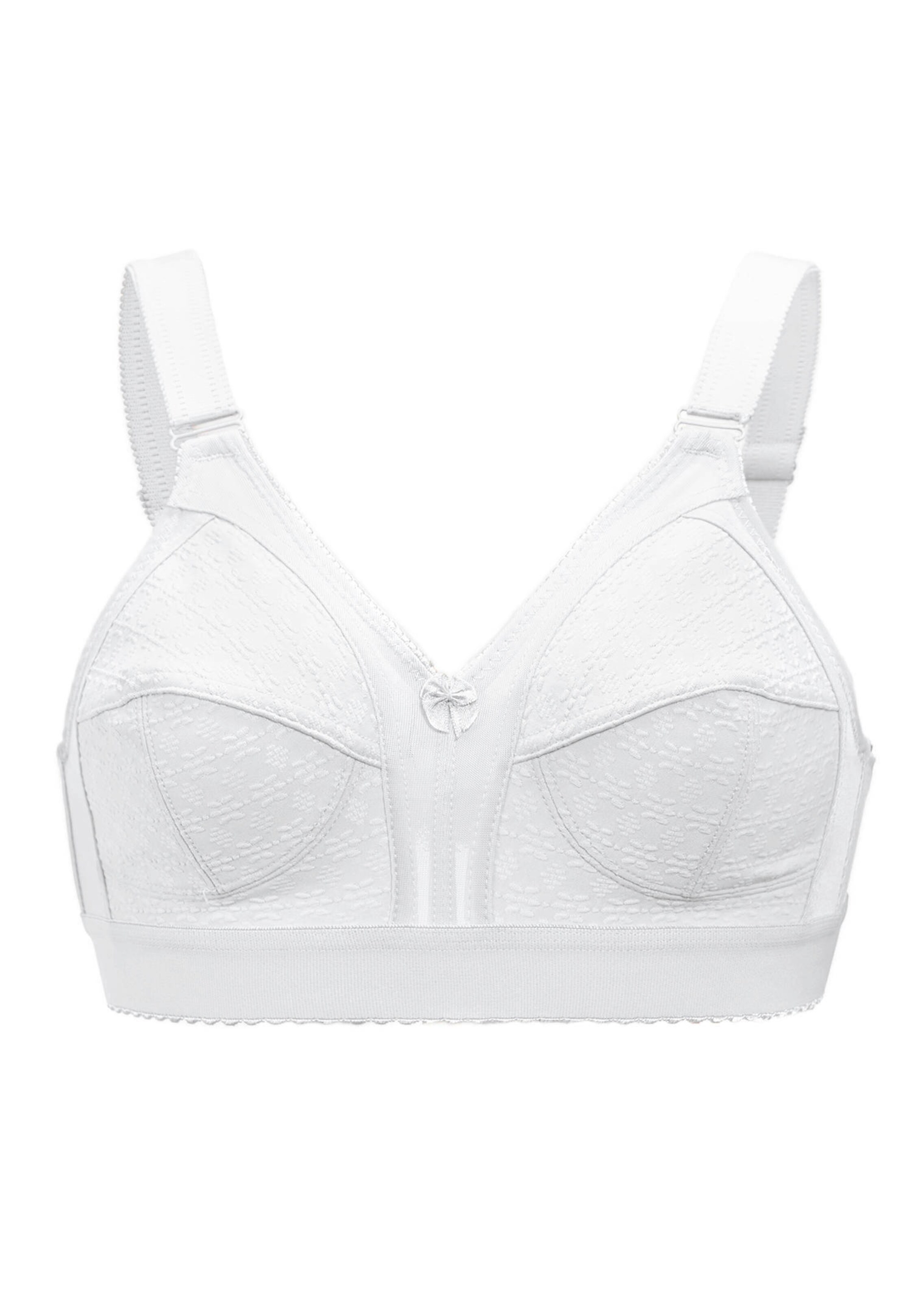 Beha van SASSA zonder beugels. Van zachte jacquard. In drieën gedeelde, gestikte cups met biesjes. Met comdortabele zachte en elastische onderborstband. De brede, elastische schouderbandjes zijn voor in lengte verstelbaar. Drievoudig verstelbare haakjessluiting achter.