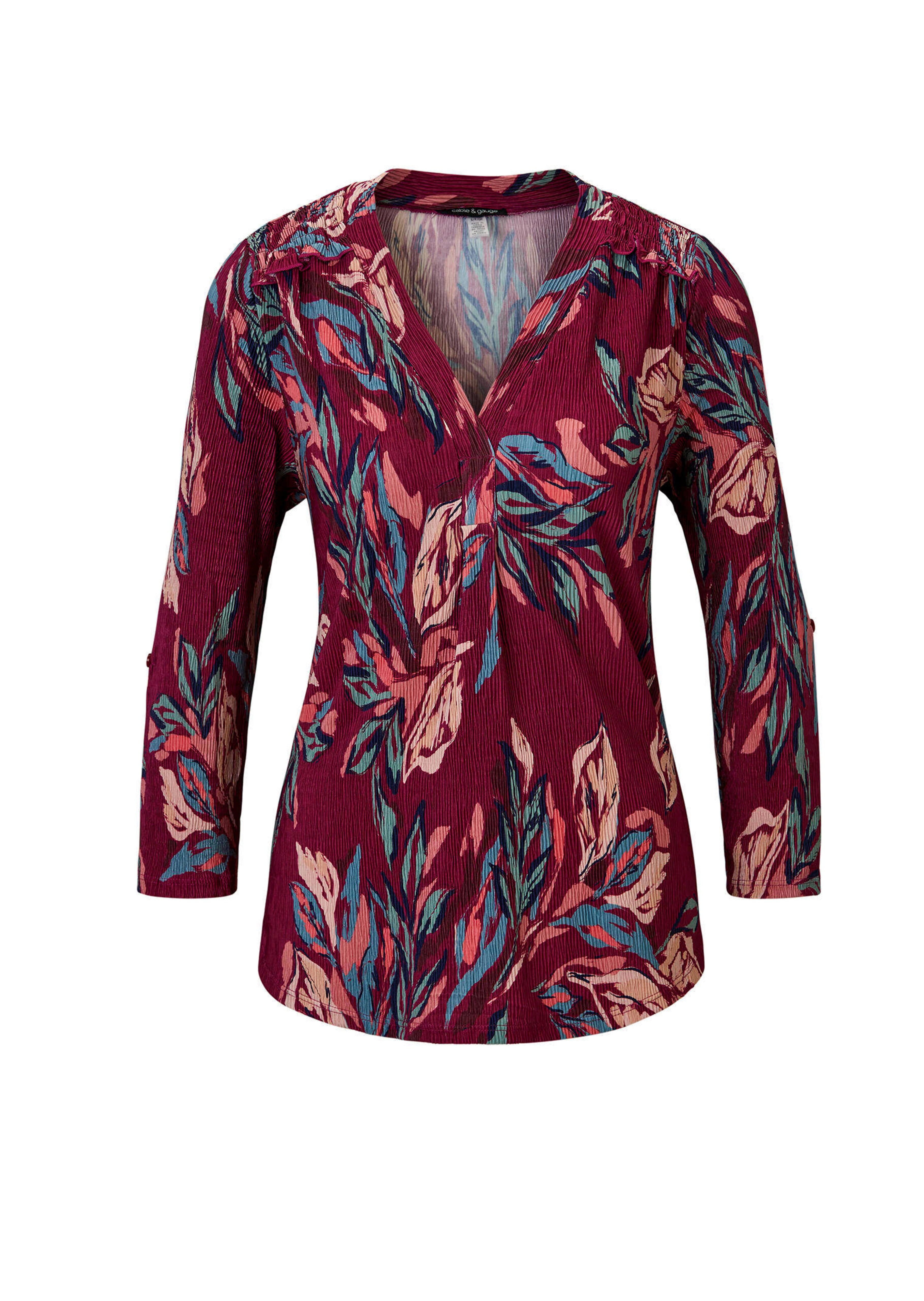 Elegante blouse met fijne smokstructuur en schitterende print allover. Een echte favoriet die veelzijdig te combineren is. De V-hals is afgewerkt met een bies, die op het voorpand leidt tot een plooi en daarmee zorgt voor een comfortabele wijdte. Kleine ruches sieren de schouderpas. Met lange mouwen, die met een knoop en trensje op 3/4-lengte vast te zetten zijn.