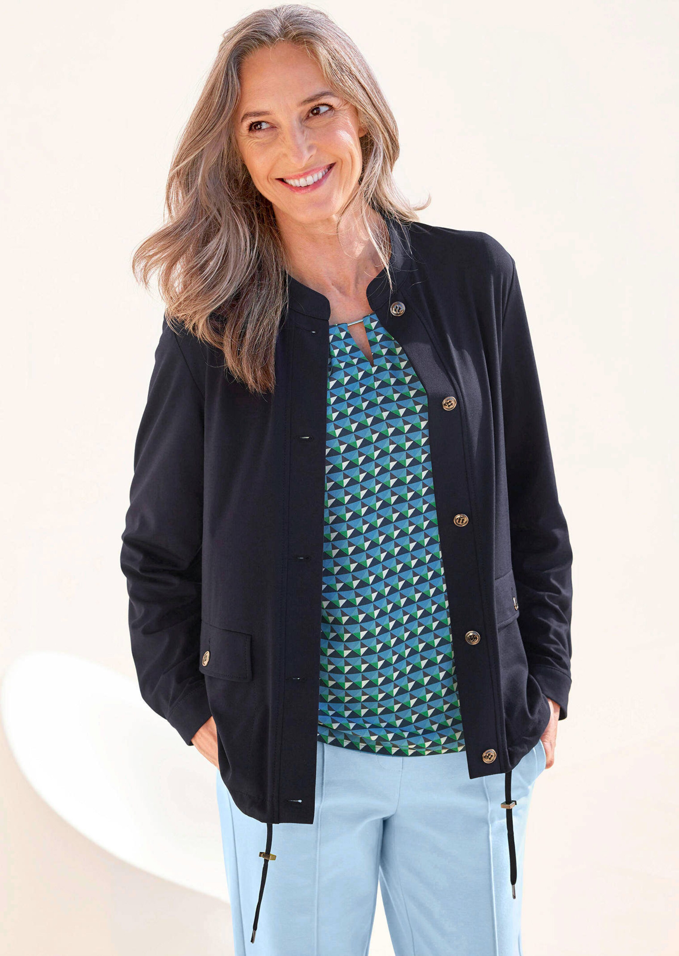 Blouson met een opstaande kraag en een manchet met knoop en splitje. De rechte zoom onderlangs heeft een tunnelkoordje en metaalkleurige koordstoppers. Individueel verstelbare zoomwijdte voor een perfecte pasvorm. Knoopsluiting met metaalkleurige viergatsknopen middenvoor. Praktische klepzakken met doorgestikte zakvoering en knoopsluiting. Het elastische tricot is niet alleen onderhoudsarm, maar ook comfortabel en aangenaam soepel. Lengte ca. 67 cm in maat 46, ca. 63 cm in maat 23.