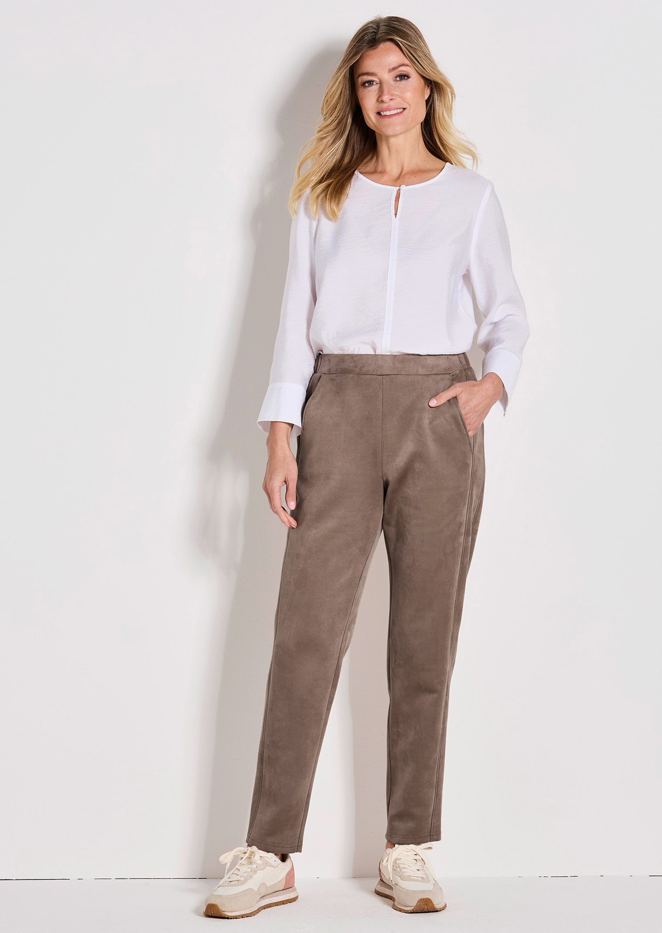 Broek LOUISA met een comfortabele, elastische tailleband. In een suèdelook, die comfort en stijl combineert. Met steekzakken voor en sierstrookzakken achter als praktische details. Deelnaden opzij laten zorgen voor een slanker silhouet. Vervaardigd van onderhoudsarm, comfortabel elastisch materiaal in suèdelook voor optimale bewegingsvrijheid. Voetwijdte ca. 38 cm. Smalle pijpen.