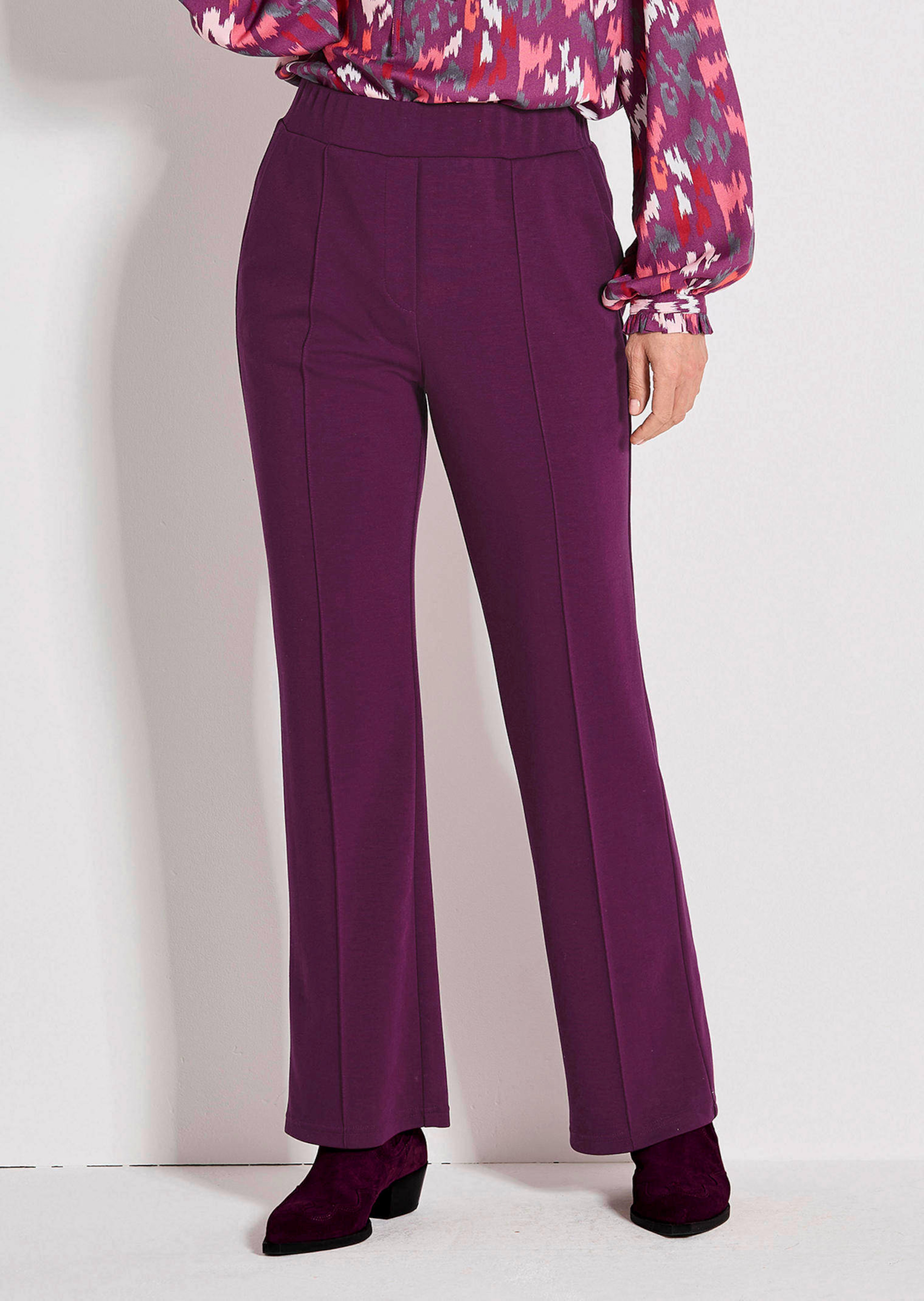 Jersey broek VERA met een platte, elastische tailleband en in een wijd model, dat er bijzonder trendy uitziet. De wijde pijpen zijn voor met biesjes afgewerkt, wat u langer laat lijken. Figuurnaden achter zorgen voor een perfecte pasvorm. De casual look wordt door de soepelvallende jersey met viscose en Elastan nog eens extra benadrukt. Met een fake ritssluiting voor en steekzakken. Voetwijdte ca. 52 cm. Wijde pijpen.