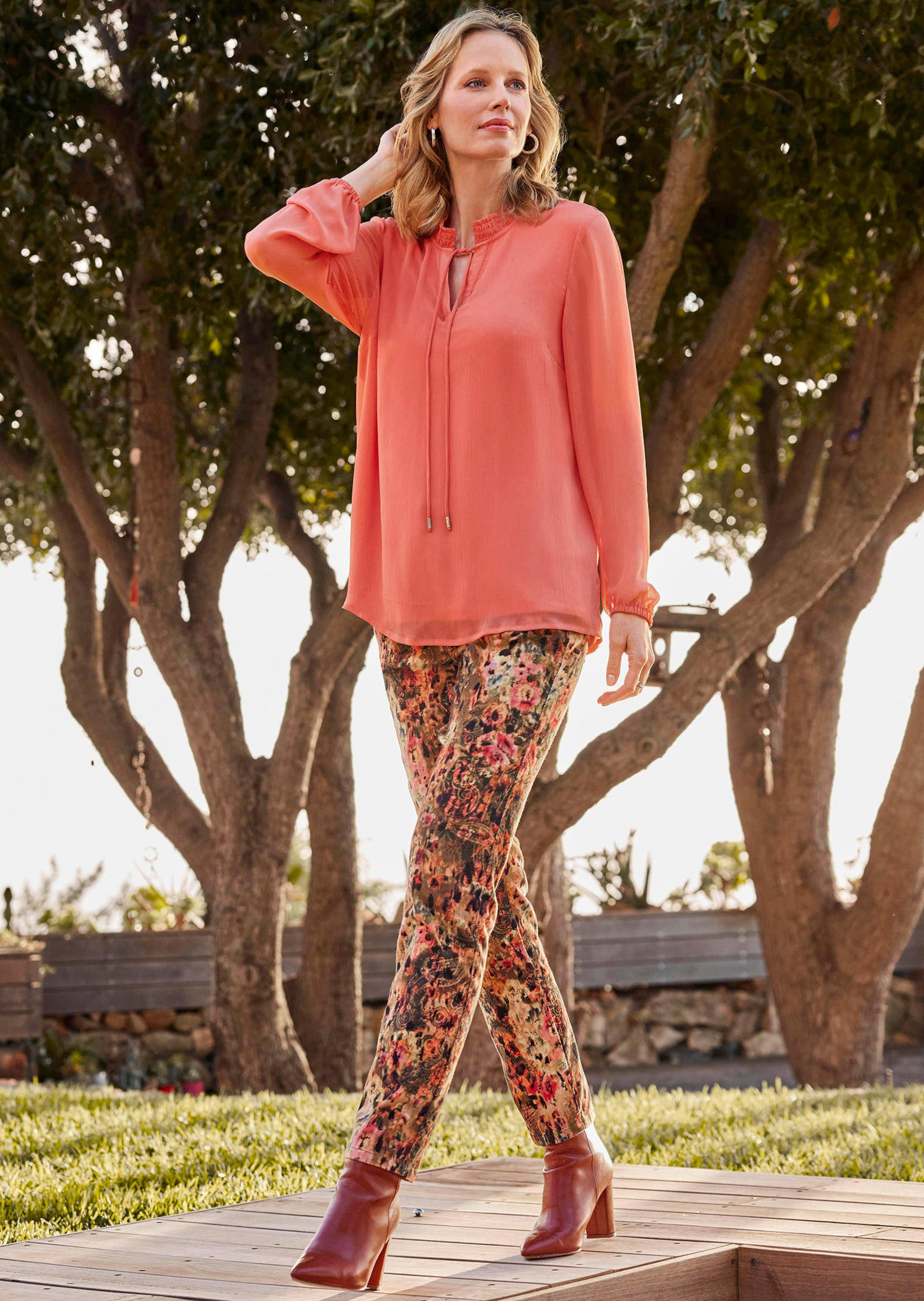 Blouse van licht chiffon, die elegantie en comfort op een aantrekkelijke manier combineert. De elegante hals met plooien en strikceintuur en de transparante, lange mouwen zorgen voor een vleugje romantiek. Voor en achter met comfortabele, onderhoudsarme jersey ondoorzichtig tegengevoerd. De iets wijdere mouwen hebben een smalle elastische boord, de flatteuze pasvorm onderstreept de speelse look. Lengte ca. 69 cm in maat 46, ca. 65 cm in maat 23.