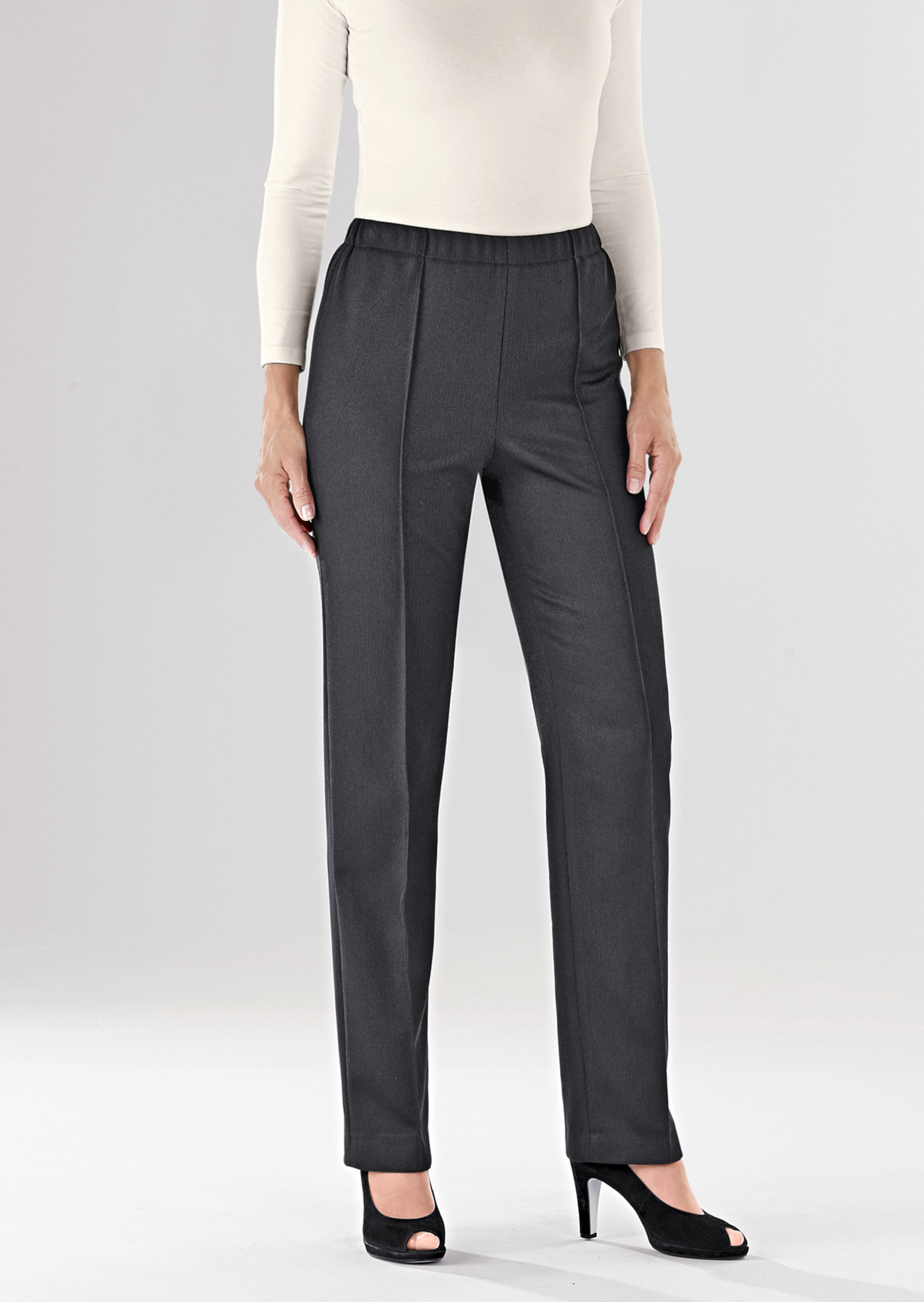 Ribbroek CARLA met een elastische tailleband. Verwen uzelf elke dag met aangenaam comfort. Het slijtvaste materiaal is aangenaam zacht, kreukarm en blijft mooi in model. Zelfs als u de broek moet wassen, is hij snel weer klaar dankzij de sneldrogende eigenschappen. Voor een flatteus figuur is het model voor met doorgestikte biesjes afgewerkt. Gewoon aantrekken en genieten van het uitstekende draagcomfort. Voetwijdte ca. 44 cm. Rechte pijpen.
