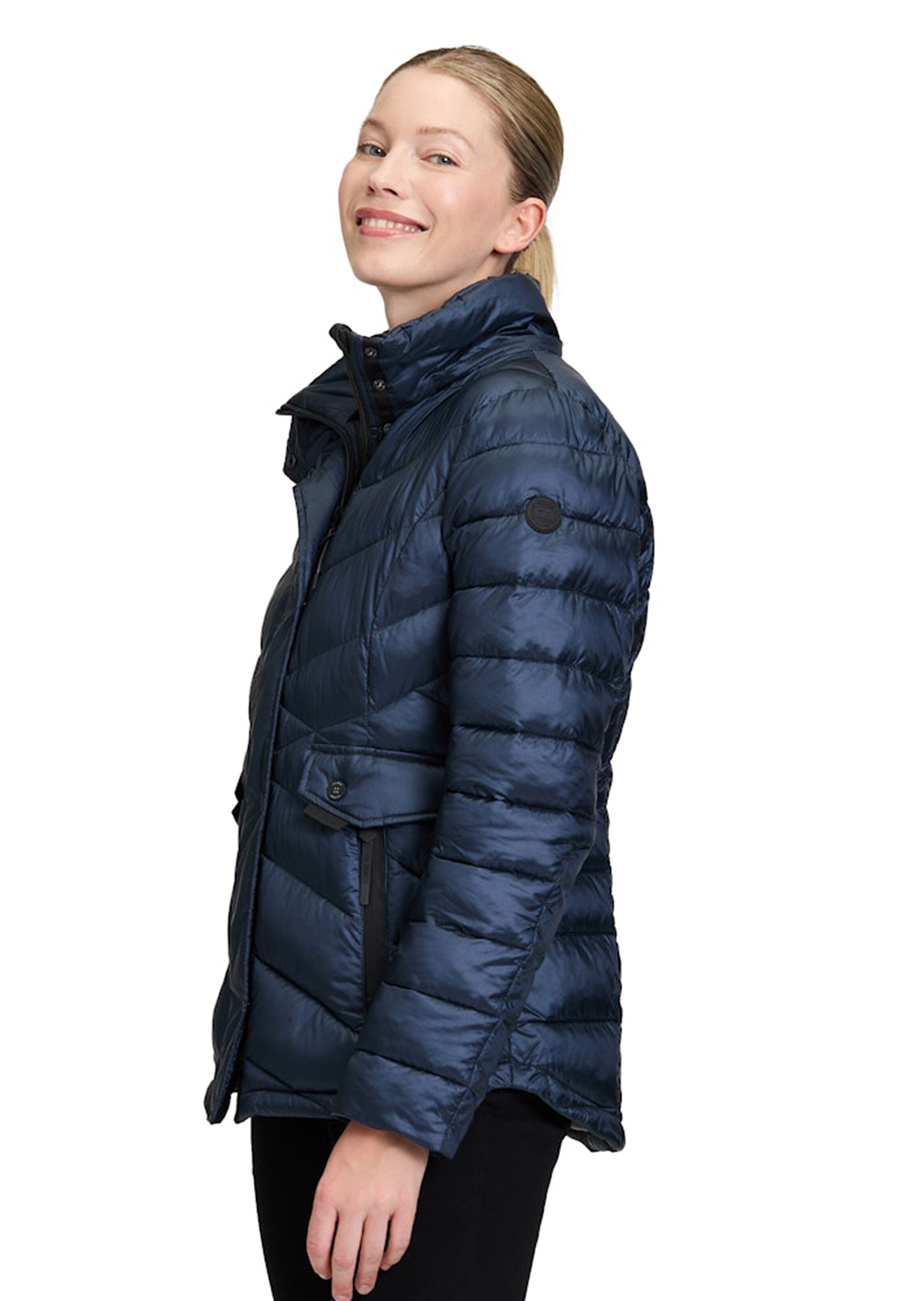 Gewatteerd jack met capuchon van GIL BRET met vormgevende deelnaden. Het sportieve stiksel glanst mooi en maakt van dit jack een echte eyecatcher. Dankzij een tunnelkoordje achter kunt u het jack naar wens tailleren. De afneembare capuchon met jersey voering is aan de onderste rand van de opstaande kraag bevestigd, zodat u goed warm blijft rond de hals. Een contrastkleurig ripsband versterkt de drukknoopsluiting, die de ritssluiting verbergt. Met jersey boord onder aan de mouwen en zakken met ritssluiting en sierpatjes opzij. Ook de binnenzak in de voering heeft een ritssluiting. Een ware favoriet, die u dankzij de eersteklas vulling van imitatiedons ook in de winter goed warm houdt! Lengte ca. 72 cm in maat 46.