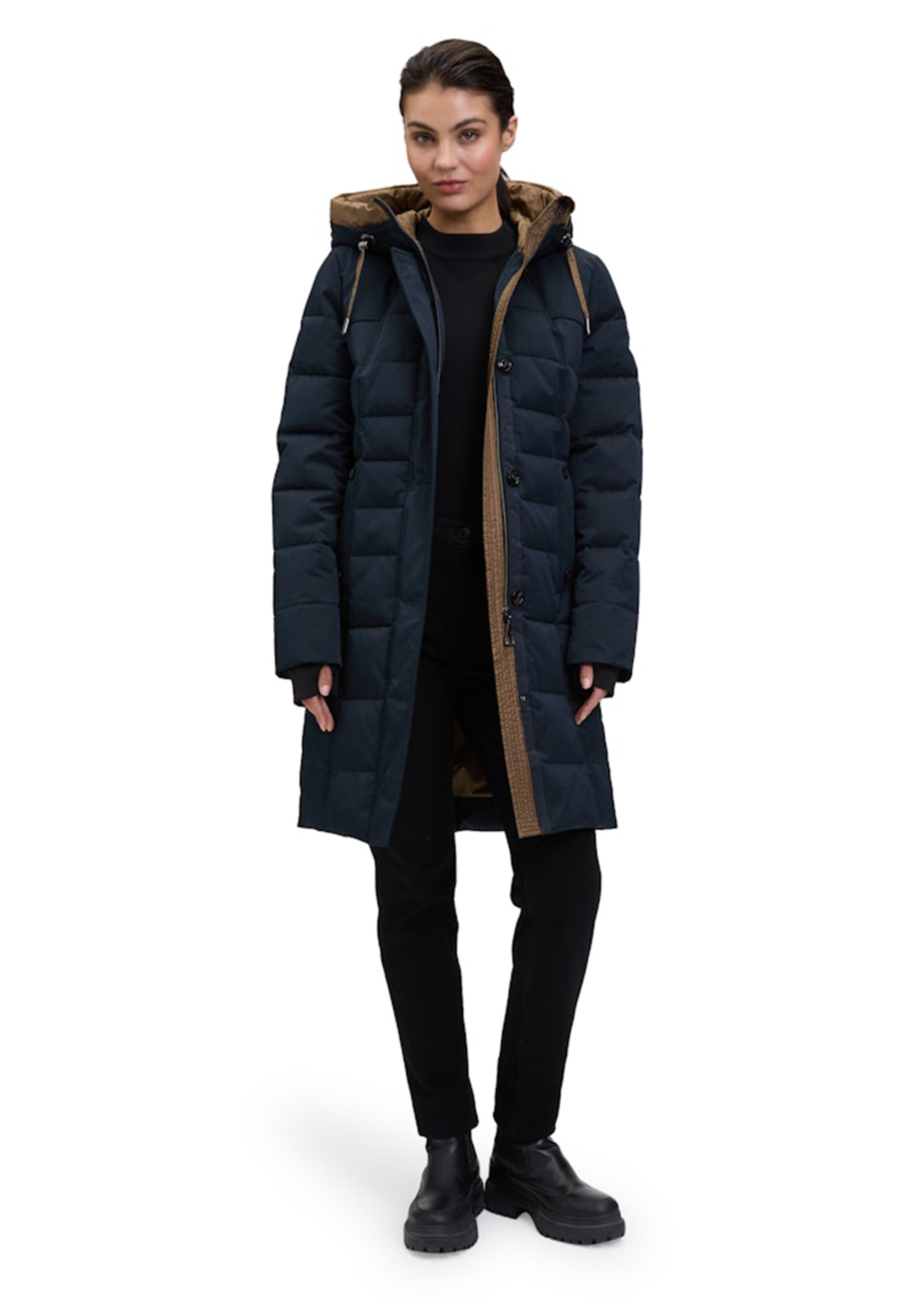 Doorgestikte mantel met capuchon van GIL BRET: de vulling van imitatiedons houdt u net zo warm als echt dons. Een must-have voor de winter! De iets uitlopende A-lijn met vormgevende deelnaden geeft deze dik gewatteerde jas een elegante uitstraling. De ritssluiting en knoopsluiting beschermen goed tegen weer en wind. Ook de jersey boord onder aan beide mouwen houdt de kou tegen. Steekzakken met een warme voering voor altijd warme handen. Met binnenzak in de voering. Lengte ca. 94 cm in maat 46.