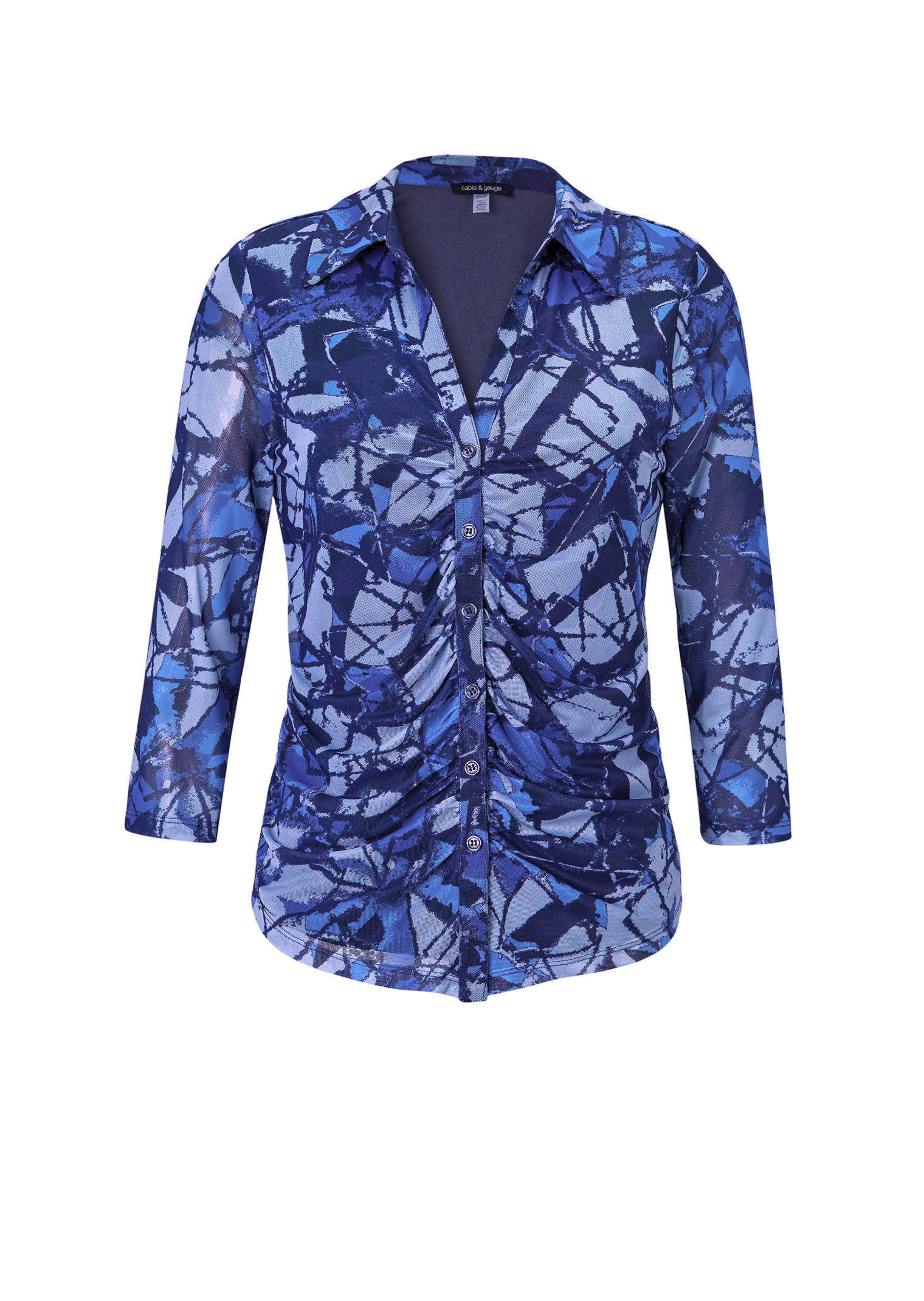 Elegante blouse in aansluitende pasvorm met fantasievolle all-over print. De overhemdkraag met een V-hals creëert een chique look en benadrukt gracieus het decolleté. Langs de knopenlijst is het materiaal mooi aangerimpeld. Semi-transparante mouwen in 3/4-lengte. Leent zich prachtig voor combinaties met blazers of tricot jasjes als modieuze blikvanger.