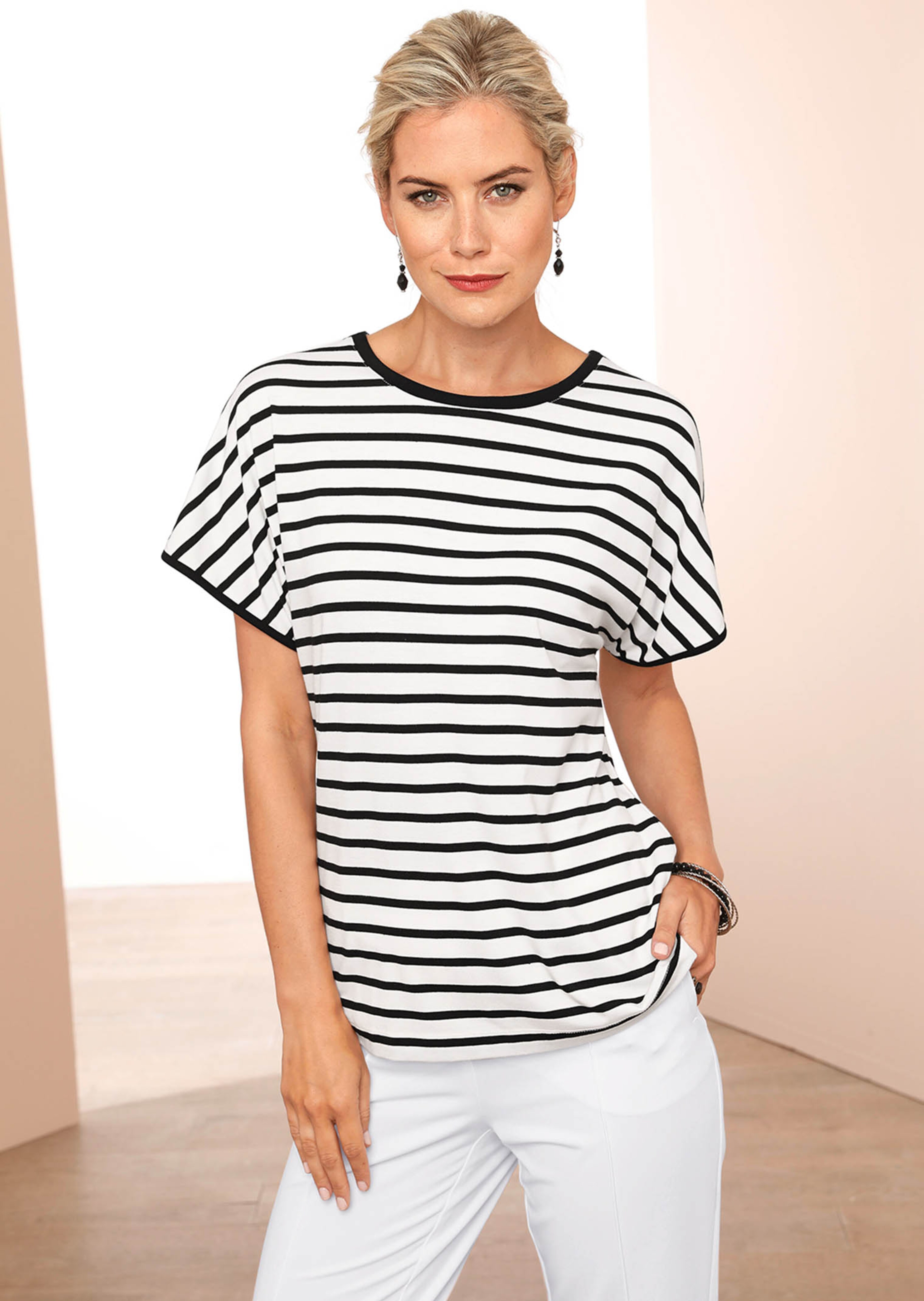 Mooi gestreept shirt met garengekleurde strepen en modieus aangeknipte schouders. De contrasterende biesjes zorgen voor markante accenten en accentueren de look. Van een heerlijk zachte en soepele kwaliteit van viscose en Elastan. Lengte ca. 66 cm in maat 46, ca. 62 cm in maat 23.