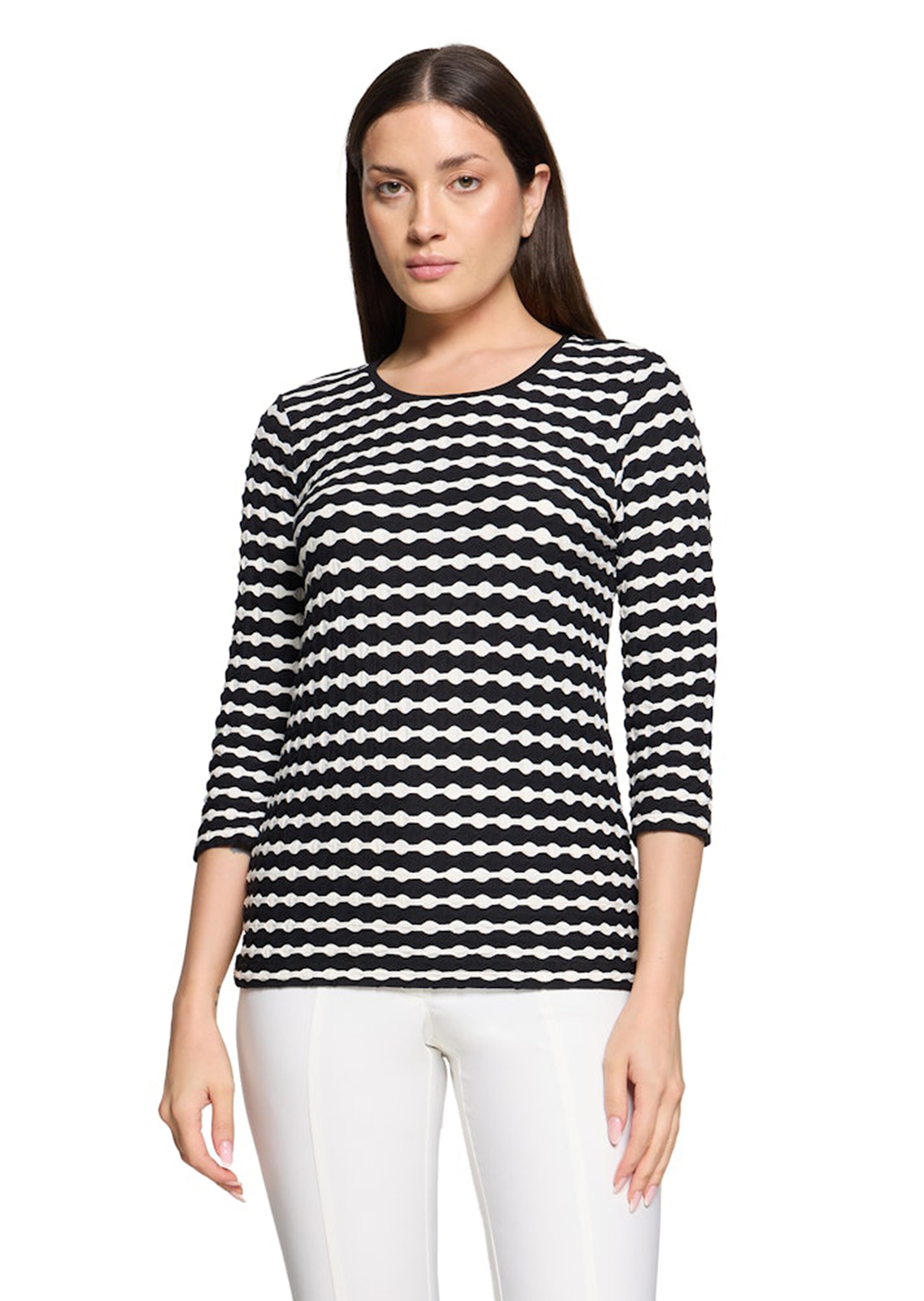 Gestreept structuurshirt van BETTY BARCLAY. Elastisch, zachte materiaal met viscose, dat mooi in model blijft. De driedimensionale look geeft dit shirt diepte en maakt het streepdessin wat meer casual. De ronde hals is smal omboord en de 3/4-mouwen verlenen het shirt een elegante look. Perfect voor iedereen die fan is van streepdessins en voor wat meer afwisseling wil gaan! Lengte ca. 68 cm in maat 46.