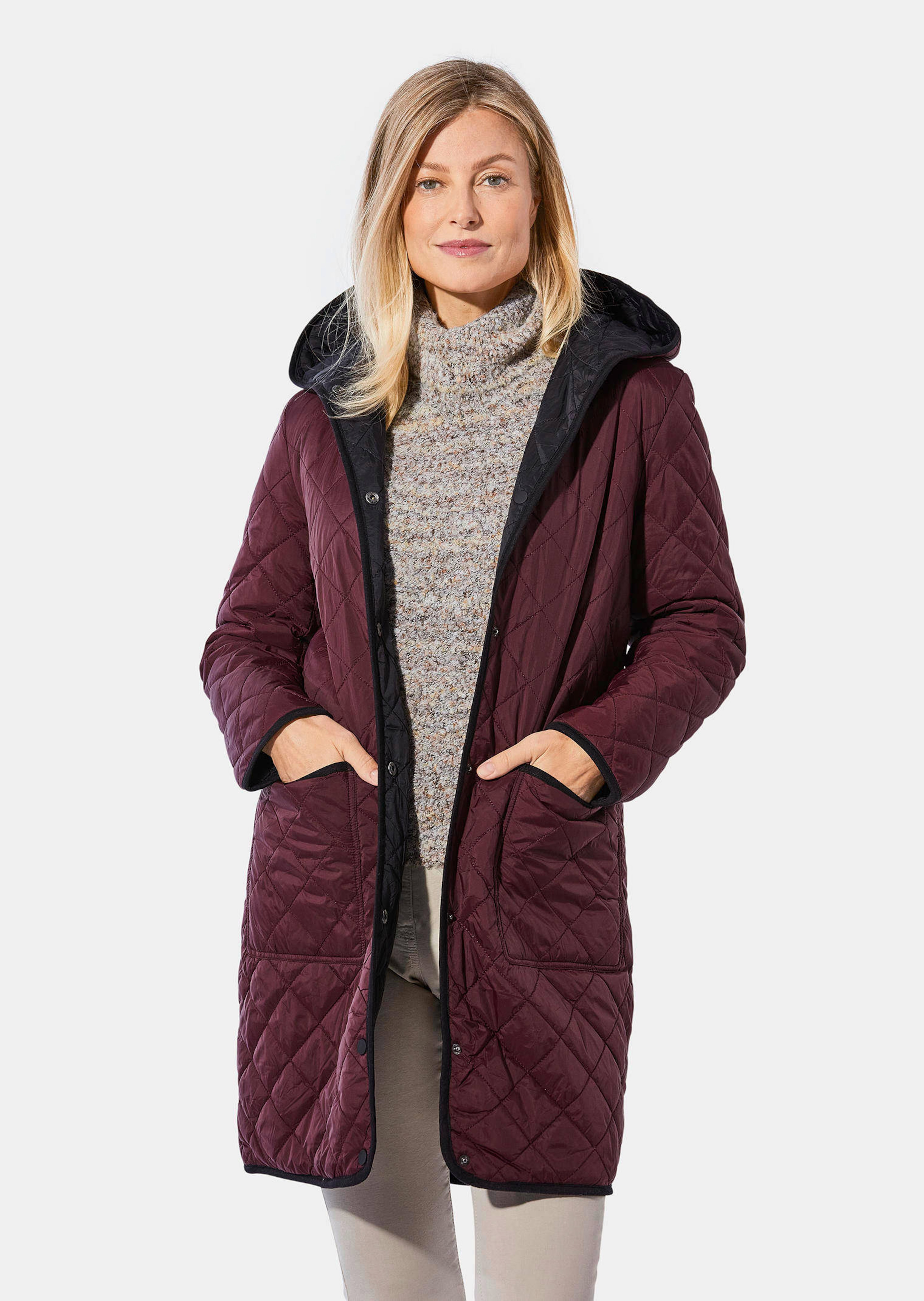 Gewatteerd jack dat keerbaar is: het aantrekkelijke 2-in-1-model heeft twee verschillend gekleurde kanten. Al naargelang uw stemming draagt u de zwarte of de gekleurde kant aan de buitenkant. Aan beide kanten zijn opgestikte zakken geplaatst. Zo heeft u altijd twee buiten- en twee binnenzakken. Het jack met tijdloos ruitstiksel is gemakkelijk met drukknopen te sluiten en beschermt met een capuchon en in een langer model perfect tegen weer en wind. Dit model valt een maat kleiner uit. U kunt dit jack het beste een maat groter bestellen.