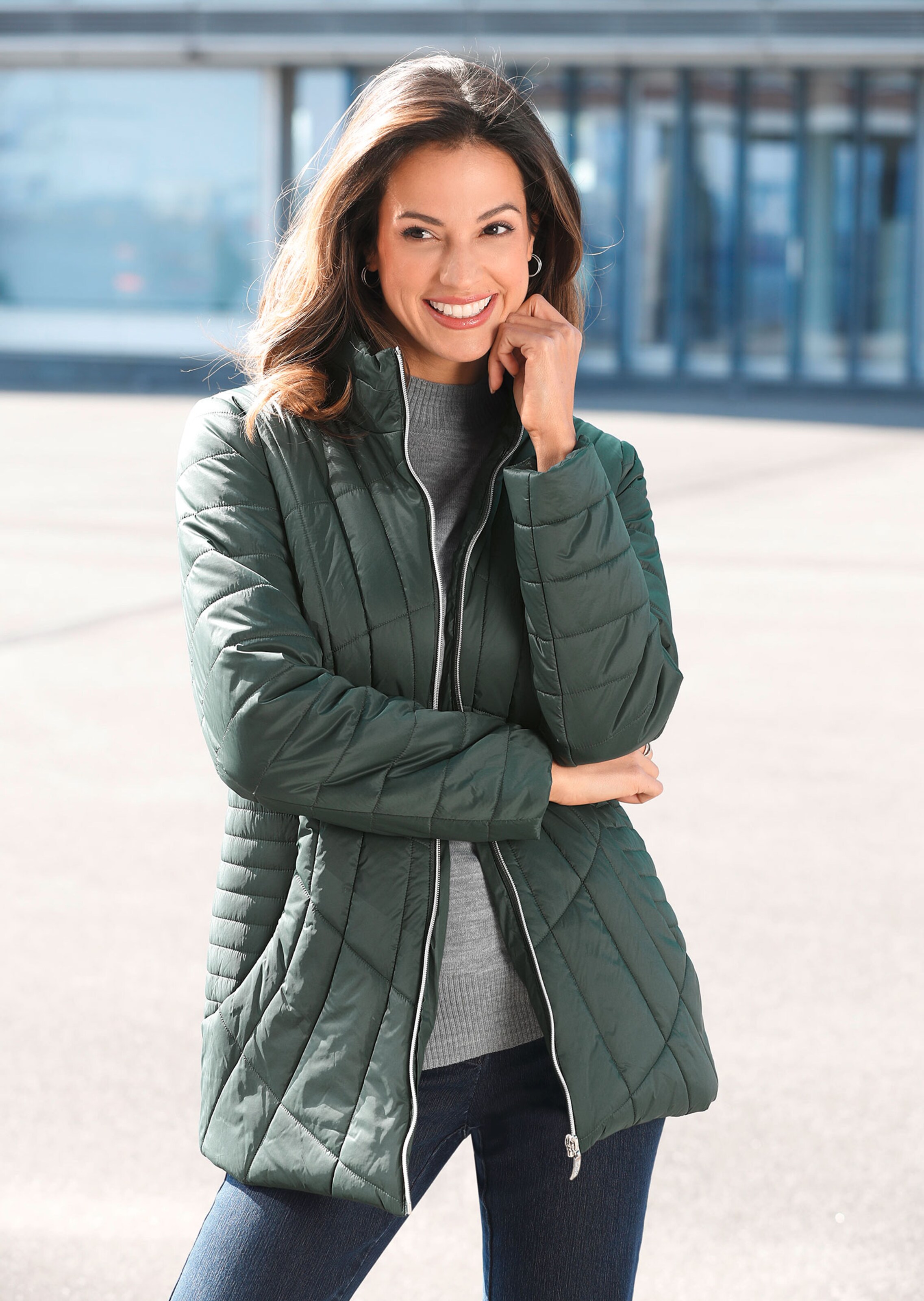 Gewatteerd jack met schitterende, nieuwe stiksels. Aan beide kanten van de ritssluiting met lengtestiksels in iets gebogen vorm. Daarnaast zijn er inzetten met dwarsstiksels aan beide kanten opzij. Samen zorgt dit voor een afkledend effect. Naaddunne ritssluitingen in de zijnaden. In de kraag bevindt zich een lichte capuchon, die snel uit en op te rollen is. De zakken zijn gevoerd met heerlijk zachte fleece. Met embleem op de linkermouw. Lengte ca. 76 cm in maat 46, ca. 72 cm in maat 23.