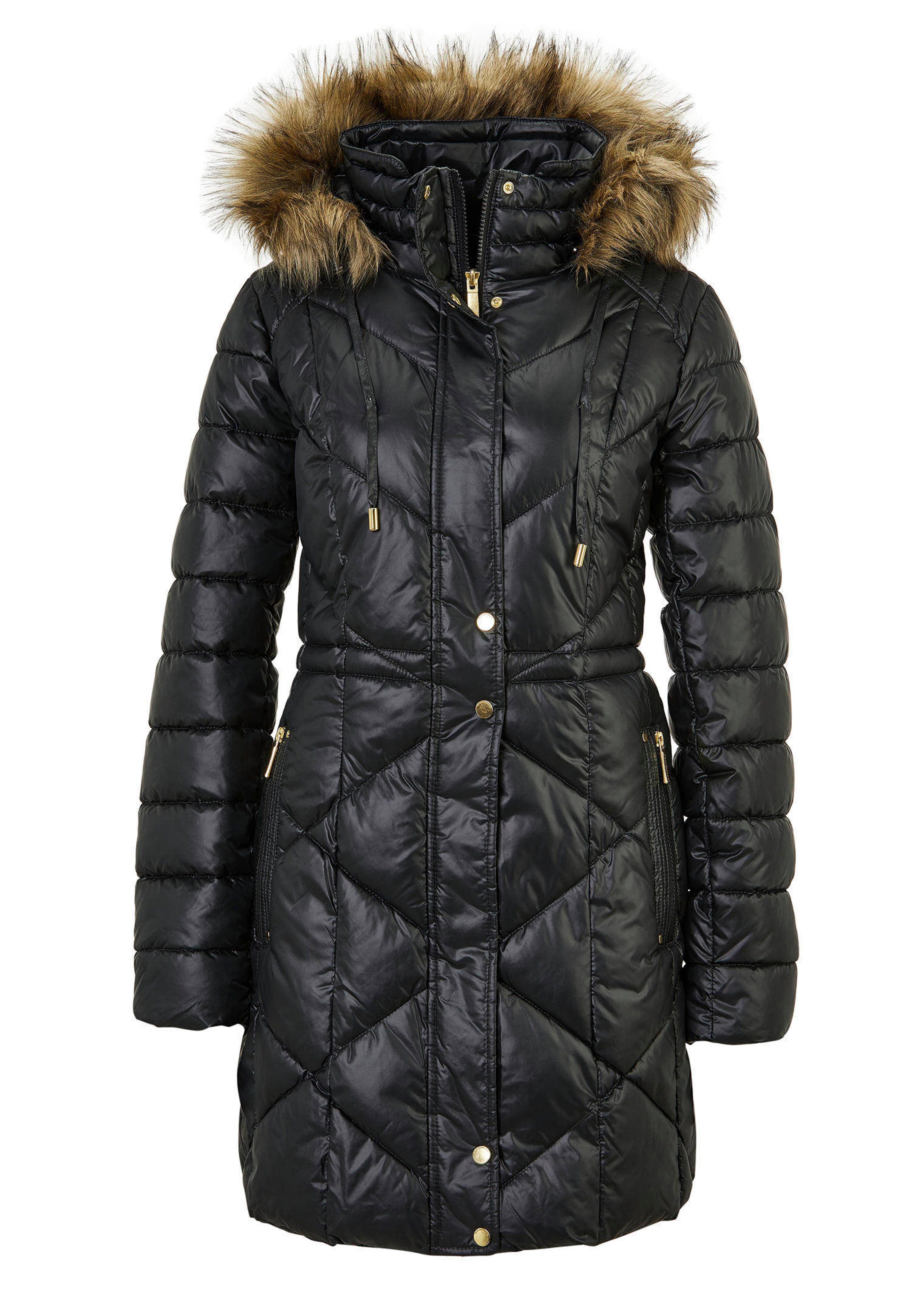 Gewatteerd jack, warm gevoerd, dus goed voor de winter. Voor en achter met royaal ruitstiksel. De mouwen zijn in de breedte doorgestikt. Coupenaden voor en achter zorgen voor een mooie pasvorm. Daarnaast kunt u het jack met elastiek in de taille aansluitend maken. Een echte blikvanger is het beleg van imitatiebont bij de capuchon, die dankzij de drukknopen naar wens afneembaar is. Een opstaande kraag beschermt tegen wind. Ook de ritssluiting met knoopsluiting maakt het jack dicht. Praktische steekzakken met ritssluiting ronden het jack in lang model prima af. Dit model valt een maat kleiner uit. U kunt dit jack het beste een maat groter bestellen.