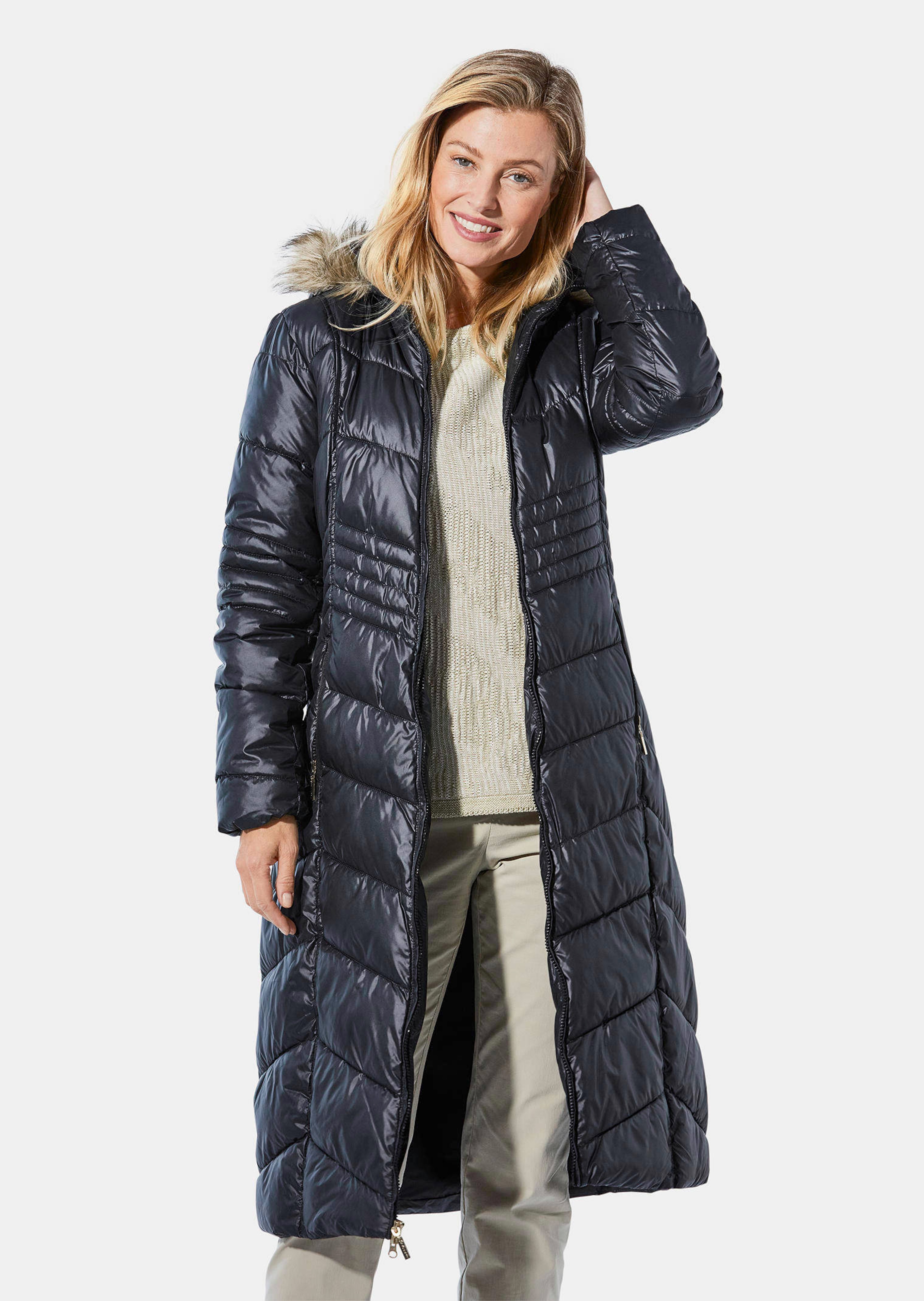 Gewatteerde mantel, die u heerlijk zacht en warm omhult. Daarbij maakt de mantel niet dik, want de diagonale chevron-stiksels met smal taillestiksel zorgt voor een slanker silhouet. De afneembare capuchon met beleg van imitatiebont is zeer opvallend. In de praktische steekzakken met ritssluiting kunt u uw waardevolle spullen veilig opbergen. Het knielange model heeft een 2-wegritssluiting – zo kunt u de sluiting naar wens aanpassen en ook bij het autorijden comfortabel zitten. Dit model valt een maat kleiner uit. U kunt deze mantel het beste een maat groter bestellen.