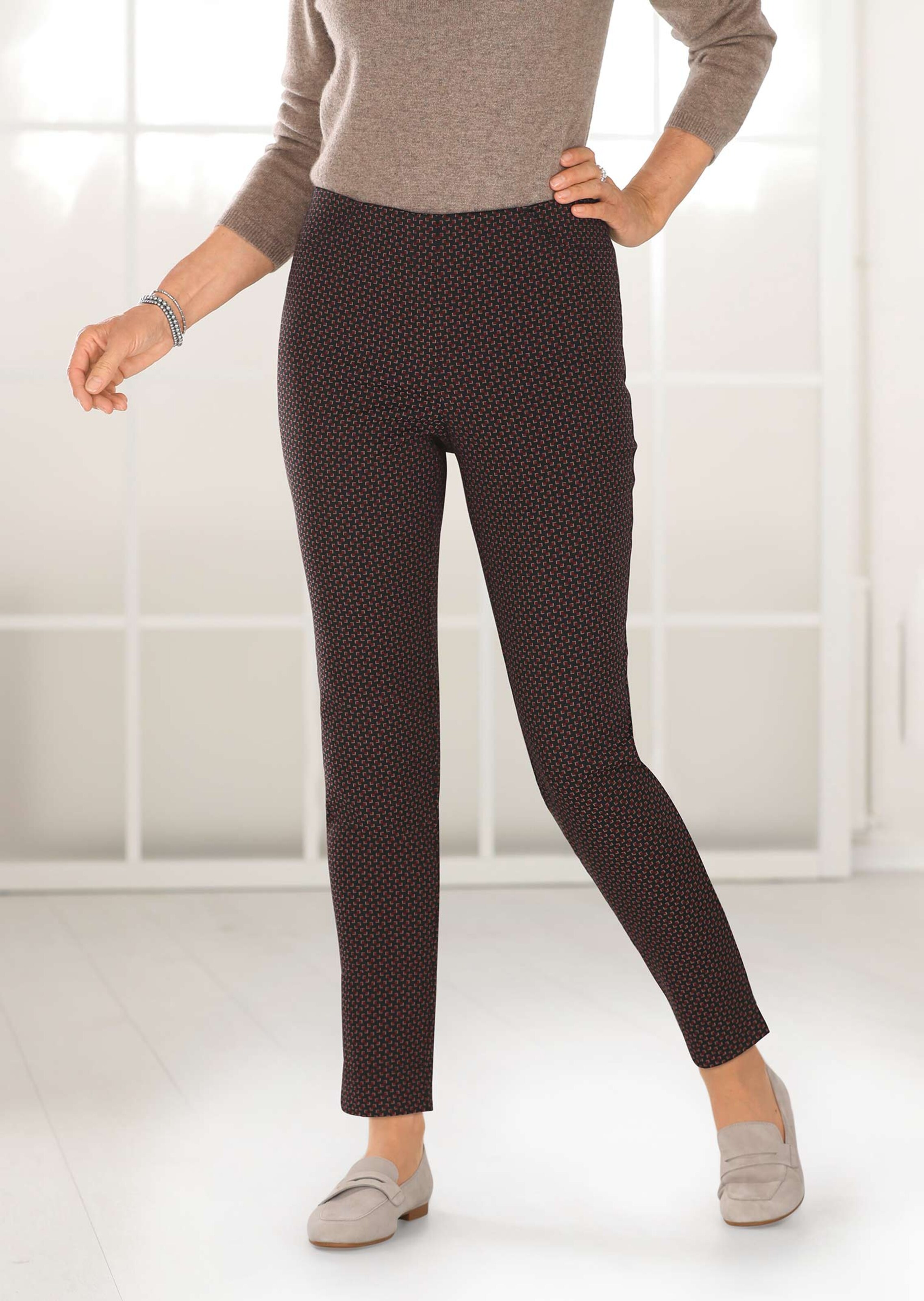 Jacquardbroek met een elastische tailleband. Met een subtiel, maar prachtig minimalistisch dessin. De stof is kreukarm en voelt prettig zacht aan op de huid. Een hoog aandeel Elastan zorgt bovendien voor veel comfort. Elegant detail: de zijsplitjes bij de zoom. Voetwijdte ca. 30 cm. Smalle pijpen.