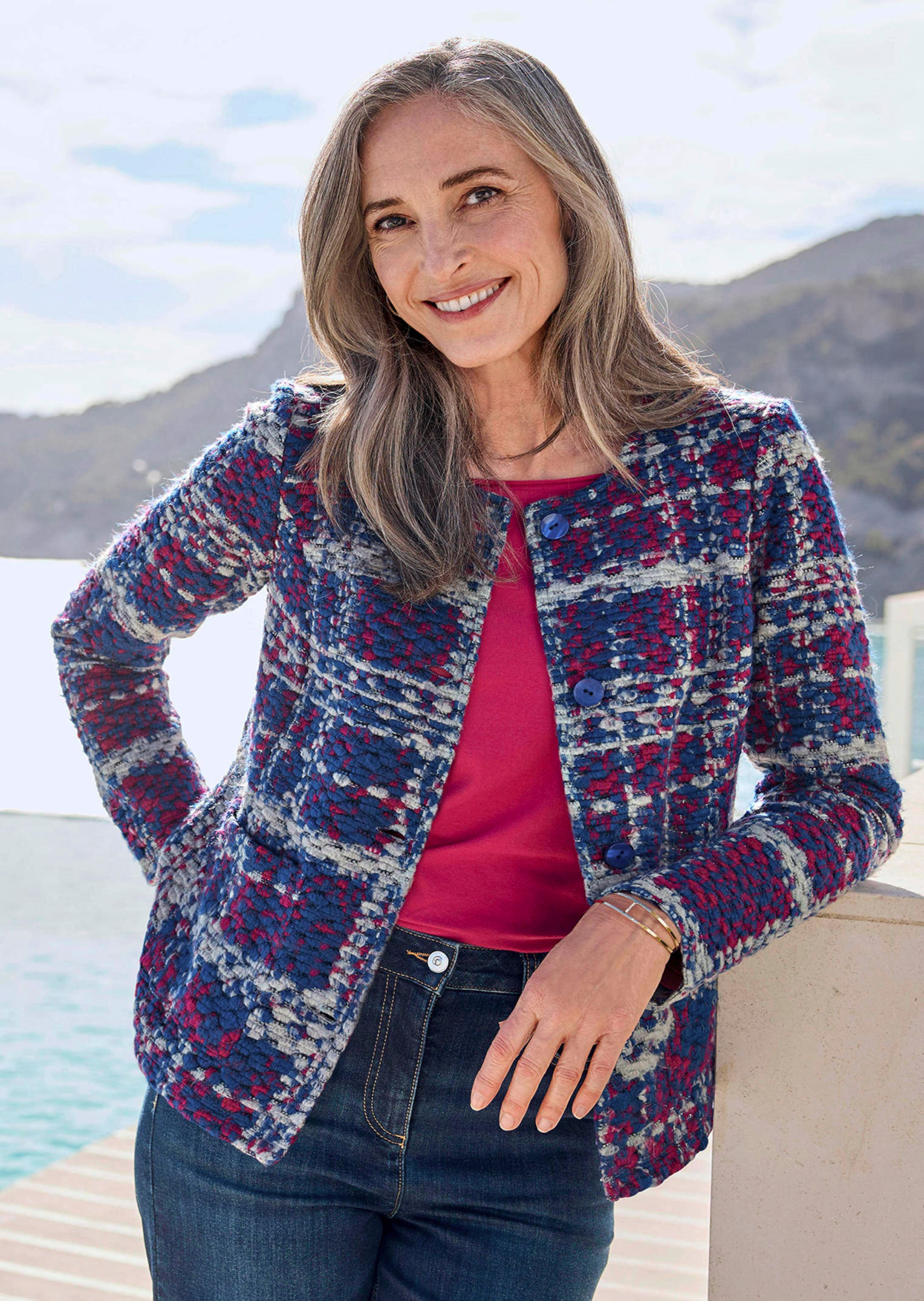 Jasje met meerkleurig jacquardpatroon in ruitlook – het structuuroppervlak in 3D-look geeft dit model een wolachtig karakter. Daarnaast is het zachte materiaal onderhoudsarm. Aansluitende pasvorm dankzij Weense naden. Ronde hals en knoopsluiting met harmonieuze knopen – het ongevoerde jasje is aan de binnenkant mooi afgewerkt met beleg. Opgestikte zakken ronden het jasje stijlvol af. Lengte ca. 62 cm in maat 46, ca. 59 cm in maat 23.