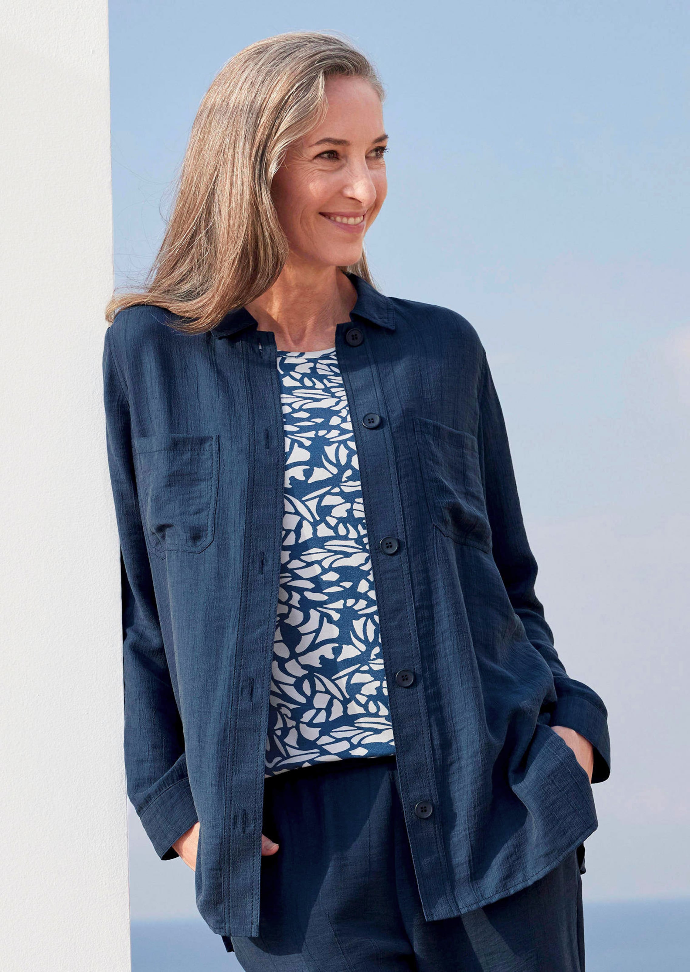 Jasje in een comfortabele viscosemix met lyocell. Het iets gestructureerde oppervlak maakt dit model veelzijdig te combineren. U kunt het jasje als overhemd of als licht outdoorjasje dragen. Naar wens kunt u de lange mouwen ook als 3/4-mouwen omslaan en met een trensje en knoop vastzetten. De langere en rechte pasvorm geeft het jasje een casual look en onttrekt kleine probleemzones handig aan het oog. Met 2 opgestikte borstzakken en 2 zijnaadzakken. Lengte ca. 79 cm in maat 46, ca. 75 cm in maat 23.