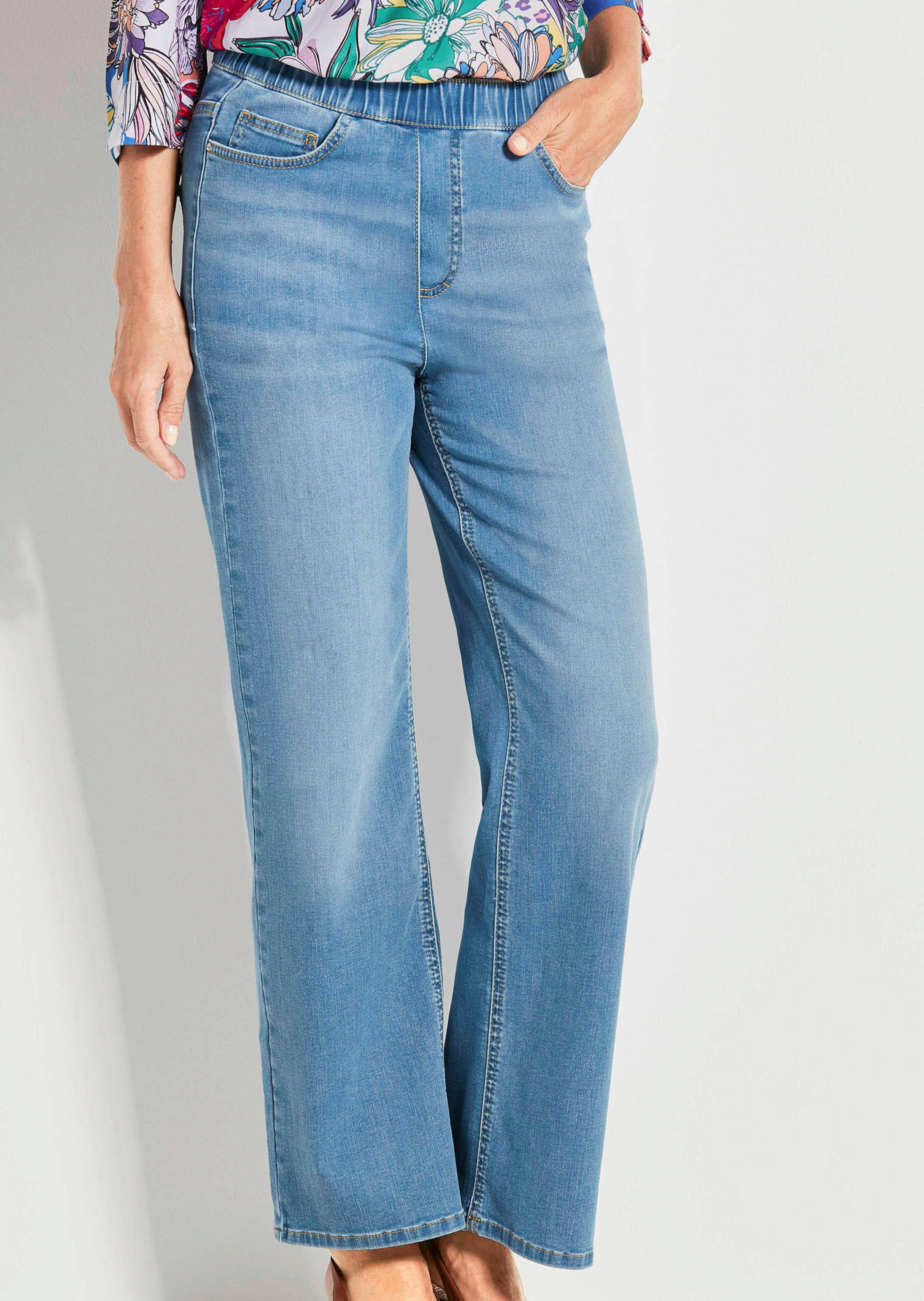 Jeans VERA met een elastische tailleband. Een comfortabele broek van buitengewone klasse: het bijzonder elastische denim knelt niet, de wijde pijpen verbloemen perfect en de iets verhoogde taille garandeert een optimale pasvorm. Met steekzakken voor en achterzakken met sierstuds en decoratief borduursel. Voetwijdte ca. 52 cm. Wijde pijpen.
