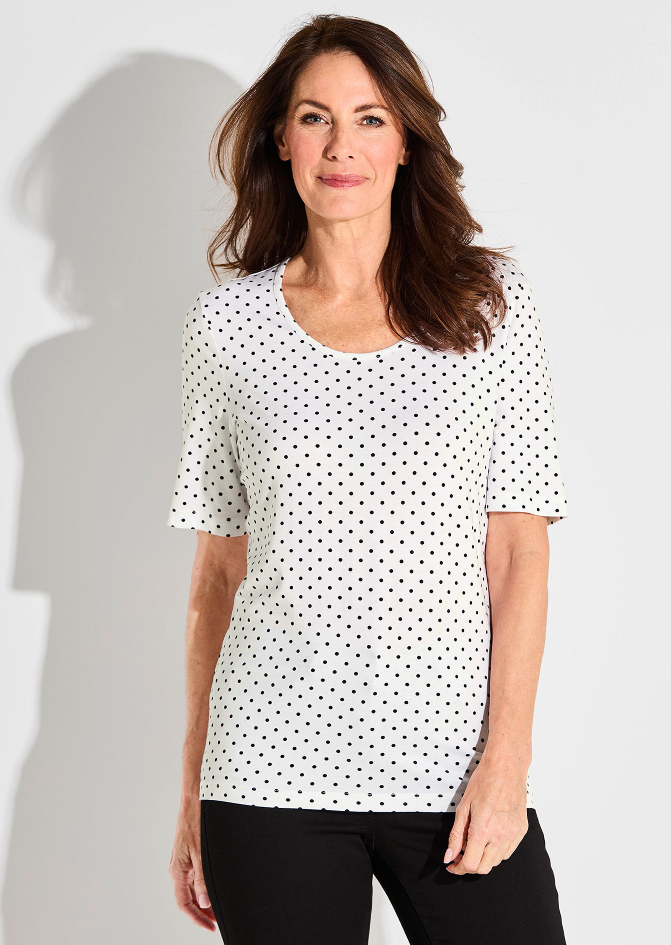 2 Shirt met een stippendessin – de contrastrijke kleurstelling en het populaire motief maken van dit model een combifavoriet! Iets getailleerde pasvorm met een ronde hals en lange mouwen. Bijzonder aangenaam dankzij huidvriendelijke viscose-jersey. Lengte ca. 64 cm in maat 46, ca. 60 cm in maat 23.
