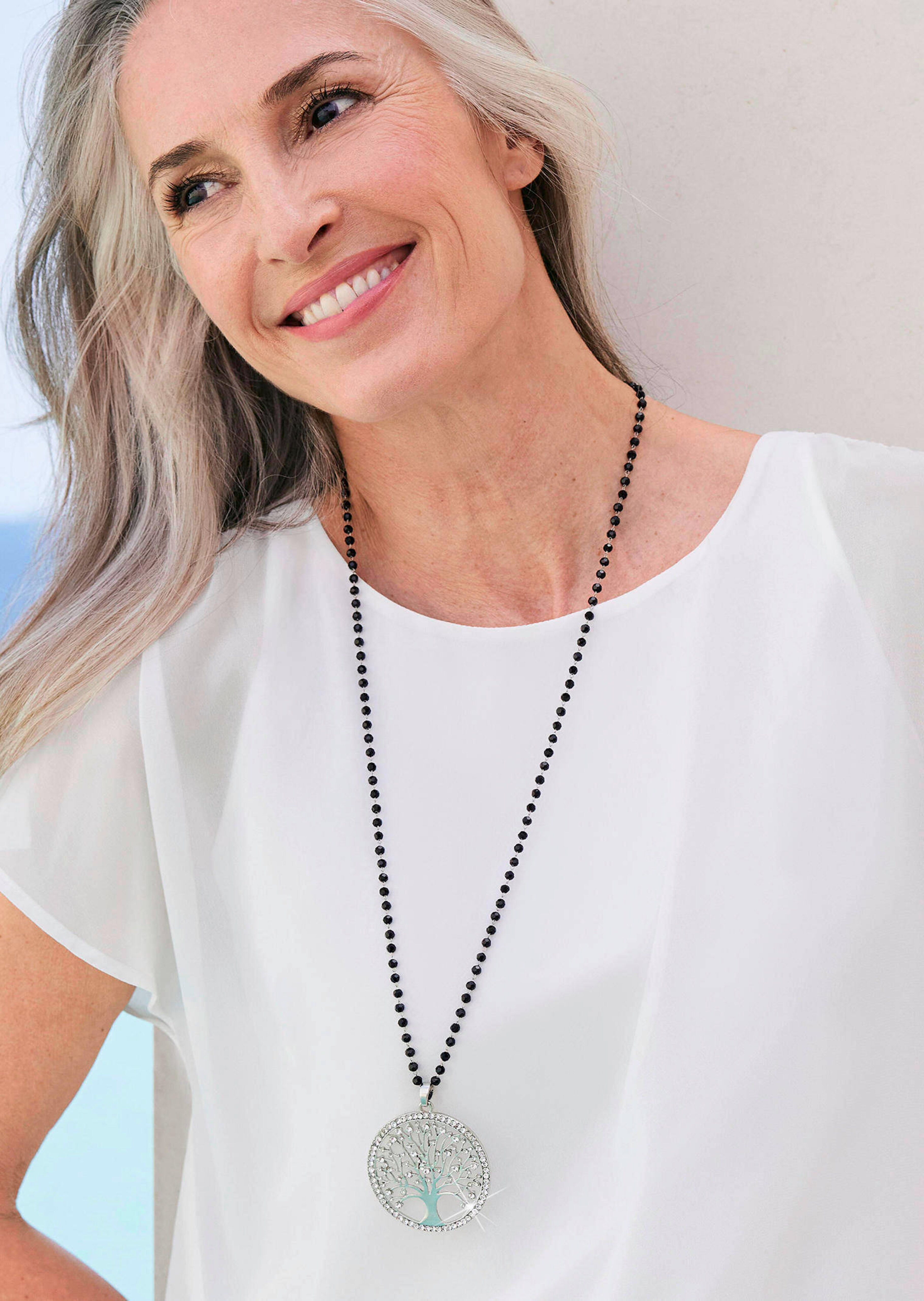 Ketting met hanger. Fonkelend. Het medaillon met levensboommotief is met kristalkleurige glassteentjes belegd. Ook de ketting is met glassteentjes afgewerkt. Lengte ca. 80 cm + 8 cm verlenging.