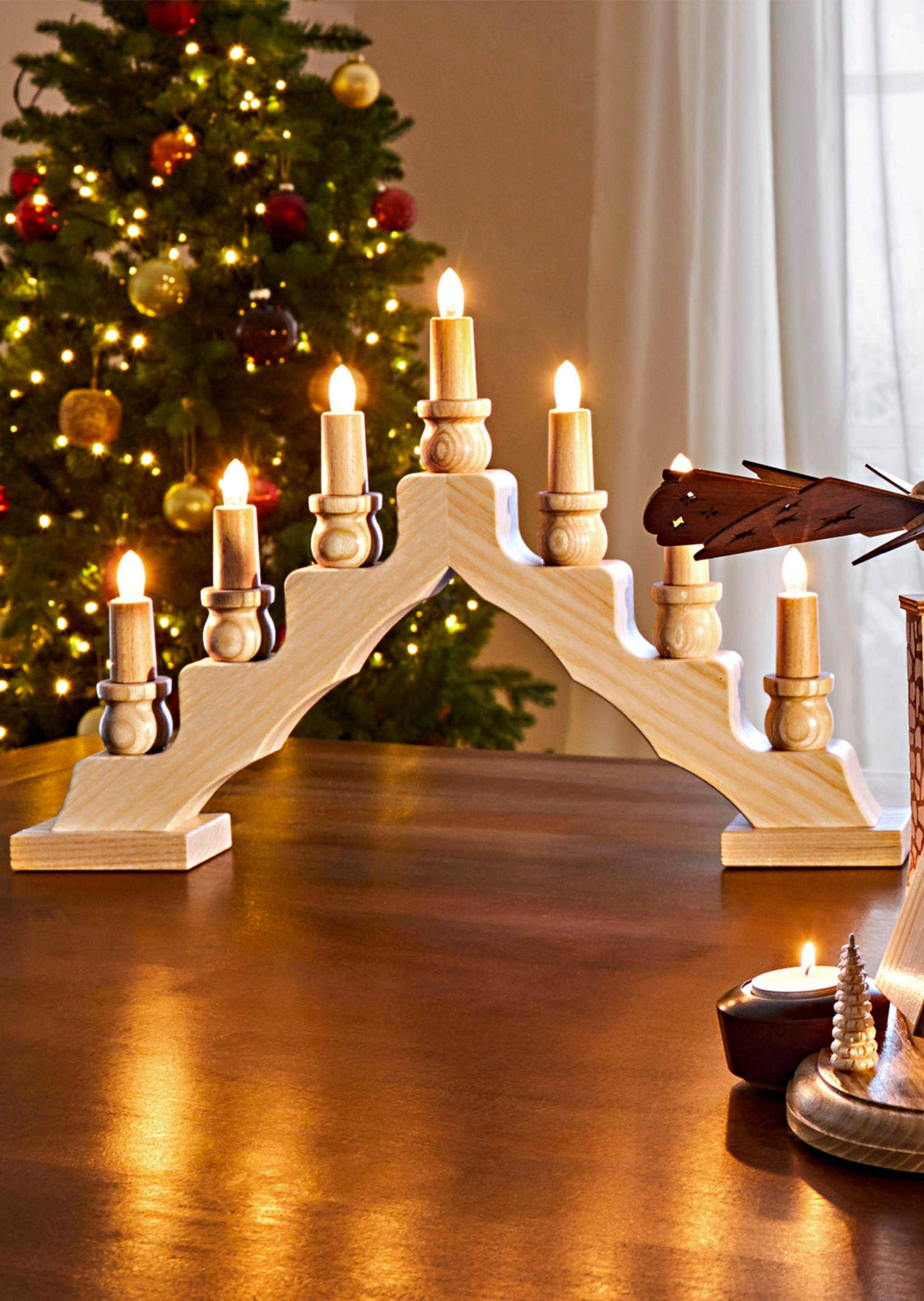 Lichtboog van SAICO. Een tijdloos elegant exemplaar van bijzondere ambachtskunst uit het Ertsgebergte. Overigens: de eerste lichtboog in driehoekig model moet in Göteborg ontstaan zijn, vandaar dat men hem ook wel 'Zweedse lamp' noemt. Van massief hout, met 7 draaikaarsen, werkt op netstroom (230 V). Made in Germany.