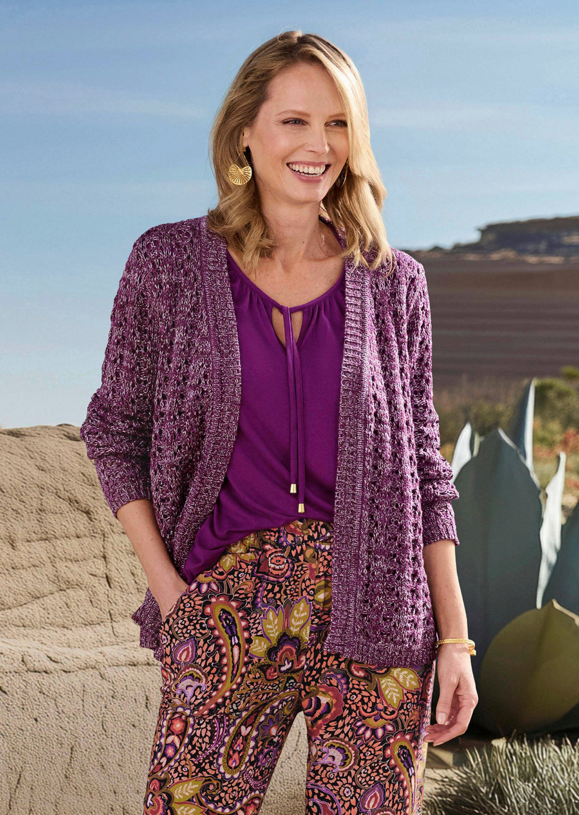 Tricot jasje van zacht, onderhoudsarm garen met een stijlvolle glans: de zachte glans en het aantrekkelijke ajourtricot in harmonieuze kleuren maken van het tricot jasje een elegante blikvanger! Model zonder sluiting, met een ribstrook en ribboord aan de lange mouwen – bijzonder gemakkelijk te combineren met shirts, blouses of jurken. Lengte ca. 67 cm in maat 46, ca. 63 cm in maat 23.