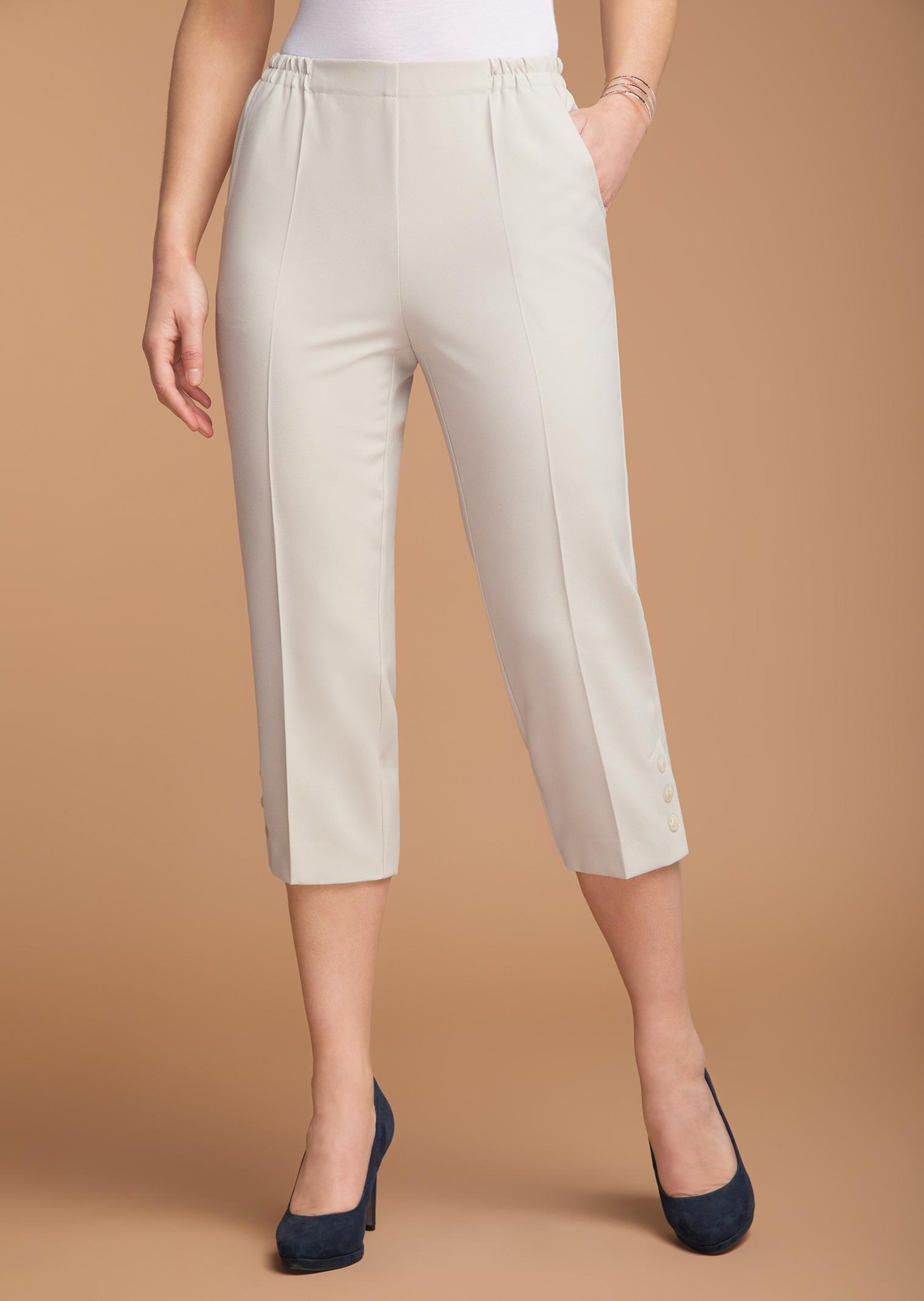 Capri met een elastische tailleband – niets knelt of zit te strak. Klassiek model met praktische steekzakken, permanent gestreken vouwen voor en achter en een klein splitje aan de pijpen met decoratieve knopen. Zeer onderhoudsvriendelijk. Voetwijdte ca. 44 cm. Rechte pijpen.