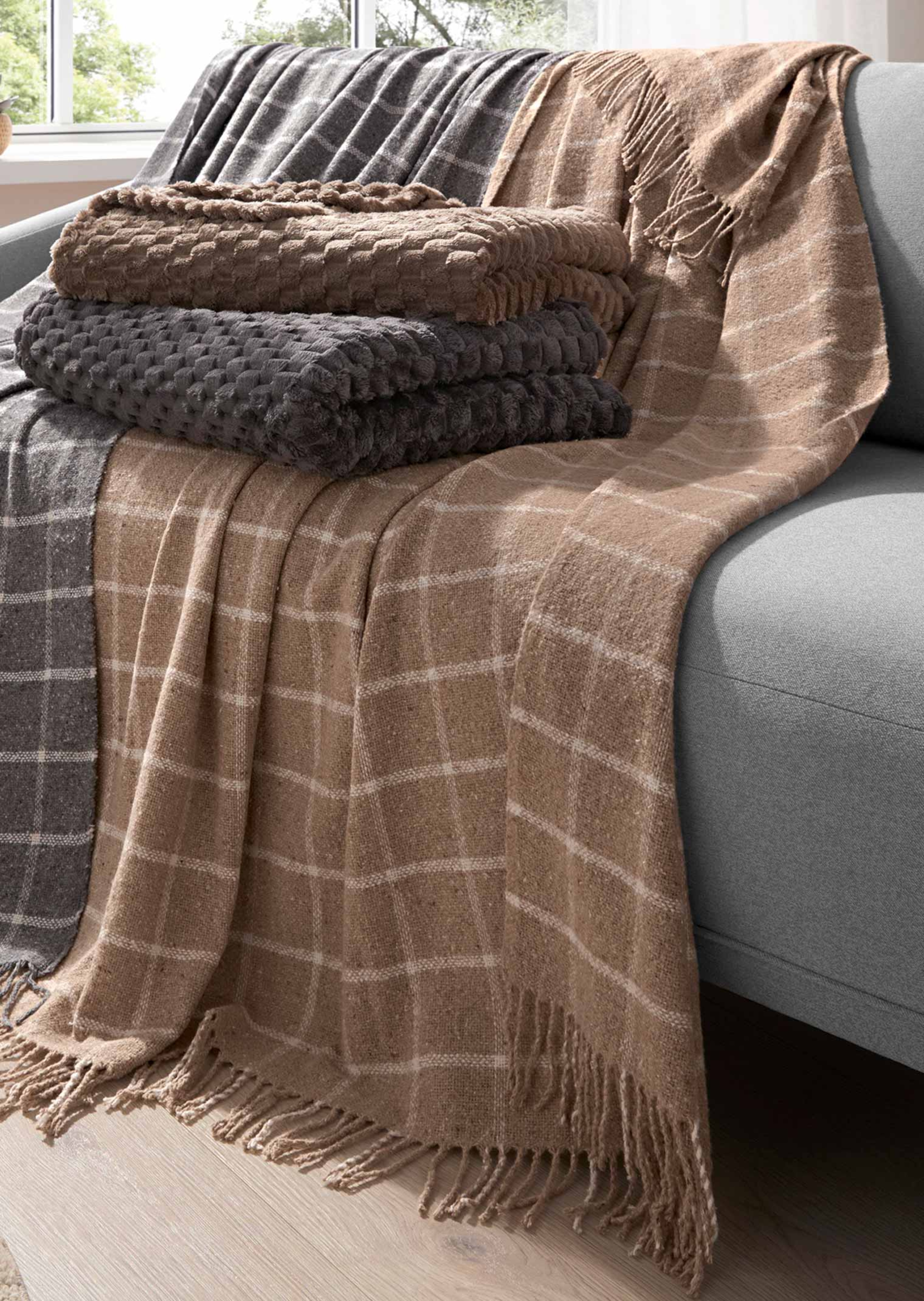 Plaid van GÖZZE in klassiek ruitdessin. De franjeranden vormen een modieus accent. De plaid heeft een stevige structuur en houdt u dankzij de wol aangenaam warm. In een heerlijk zachte materiaalmix van gerecyclede grondstoffen. Wasbaar op 30 °C (fijnwas). Afm.: 150 x 200 cm.