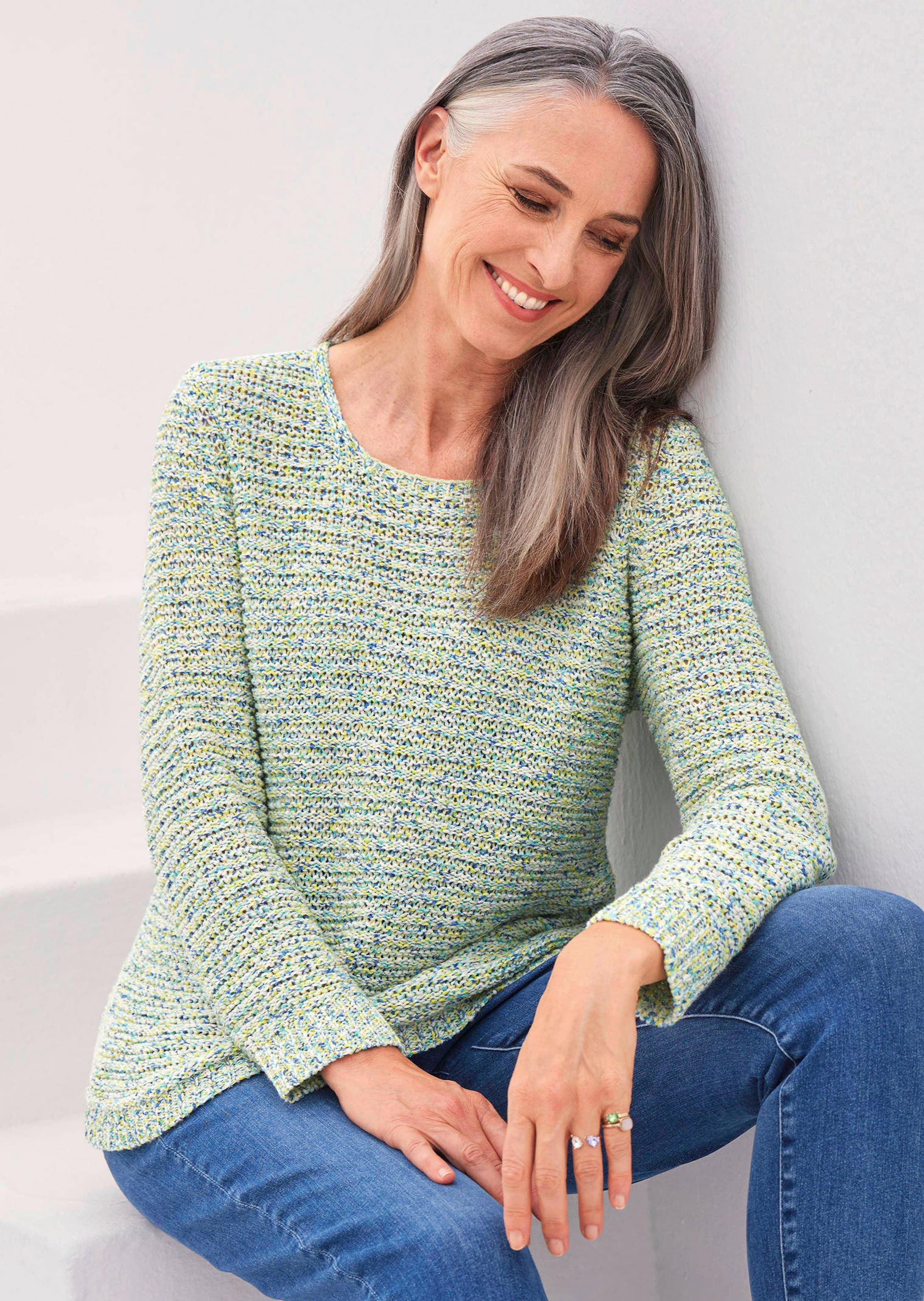 Pullover met een tricotpatroon in een horizontale riblook. De ingebreide hals valt dankzij de elegante structuurdetails extra op. Ook het veelkleurige lintjesgaren zorgt voor spannende effecten. Recht model met normale schouderverwerking, lange mouwen en ribboorden. In een onderhoudsarme, zomerse katoenmix: perfect voor warme dagen. Lengte ca. 67 cm in maat 46, ca. 63 cm in maat 23.