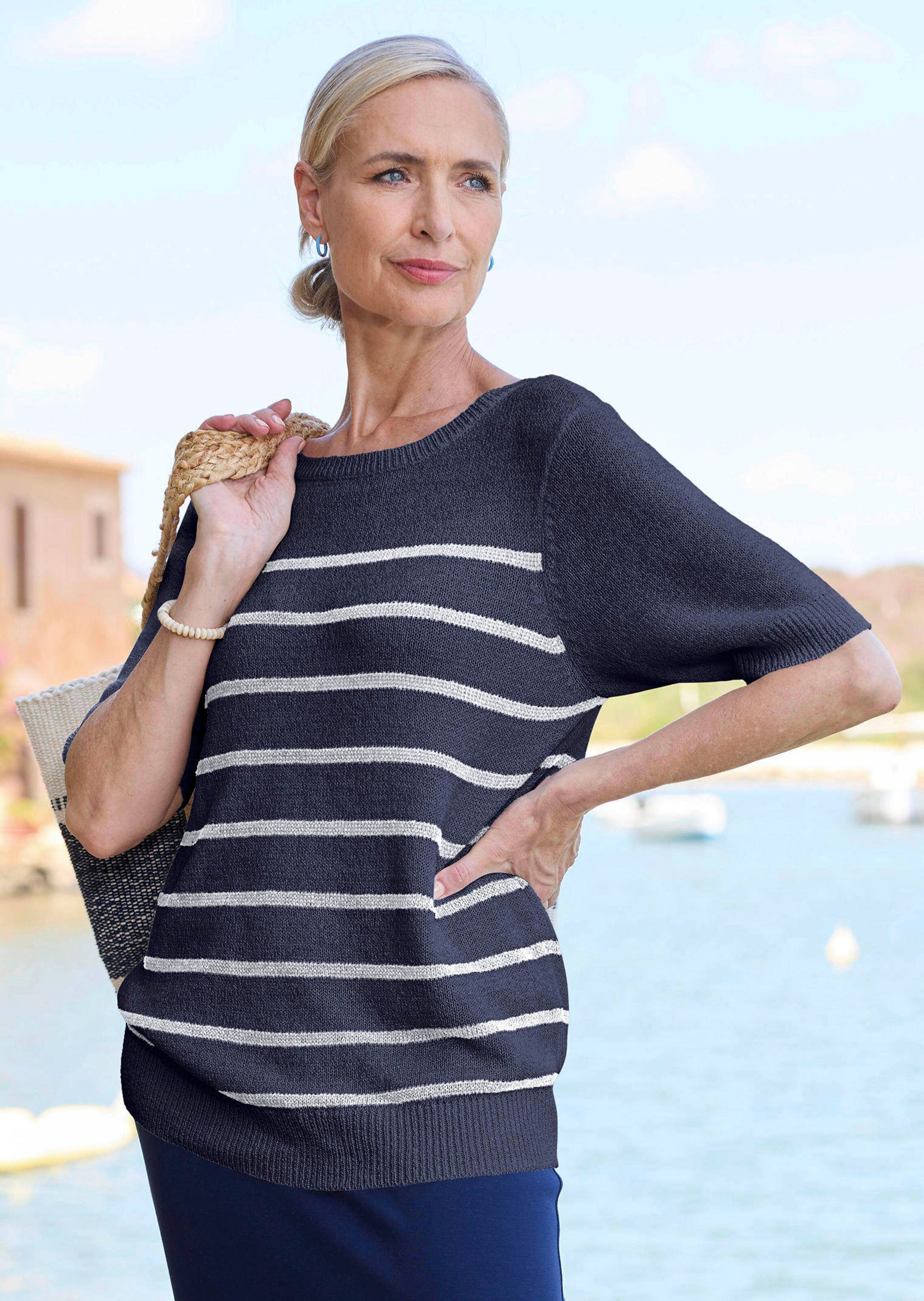 Pullover met maritiem streepverloop, dat uw outfit de perfecte look geeft! De elegante boothals is afgewerkt met een smal ribboordje. Recht model met korte mouwen en geribde zomen. Van onderhoudsarm lintjesgaren met katoen. Dit maakt de pullover koel in het dragen en aangenaam op de huid. Lengte ca. 65 cm in maat 46, ca. 61 cm in maat 23.