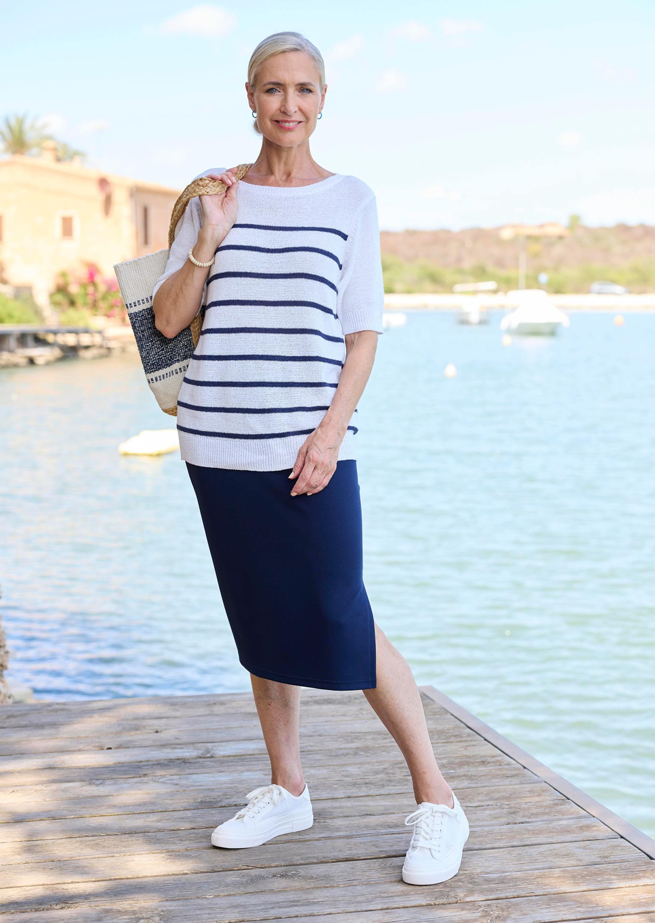 Pullover met maritiem streepverloop, dat uw outfit de perfecte look geeft! De elegante boothals is afgewerkt met een smal ribboordje. Recht model met korte mouwen en geribde zomen. Van onderhoudsarm lintjesgaren met katoen. Dit maakt de pullover koel in het dragen en aangenaam op de huid. Lengte ca. 65 cm in maat 46, ca. 61 cm in maat 23.