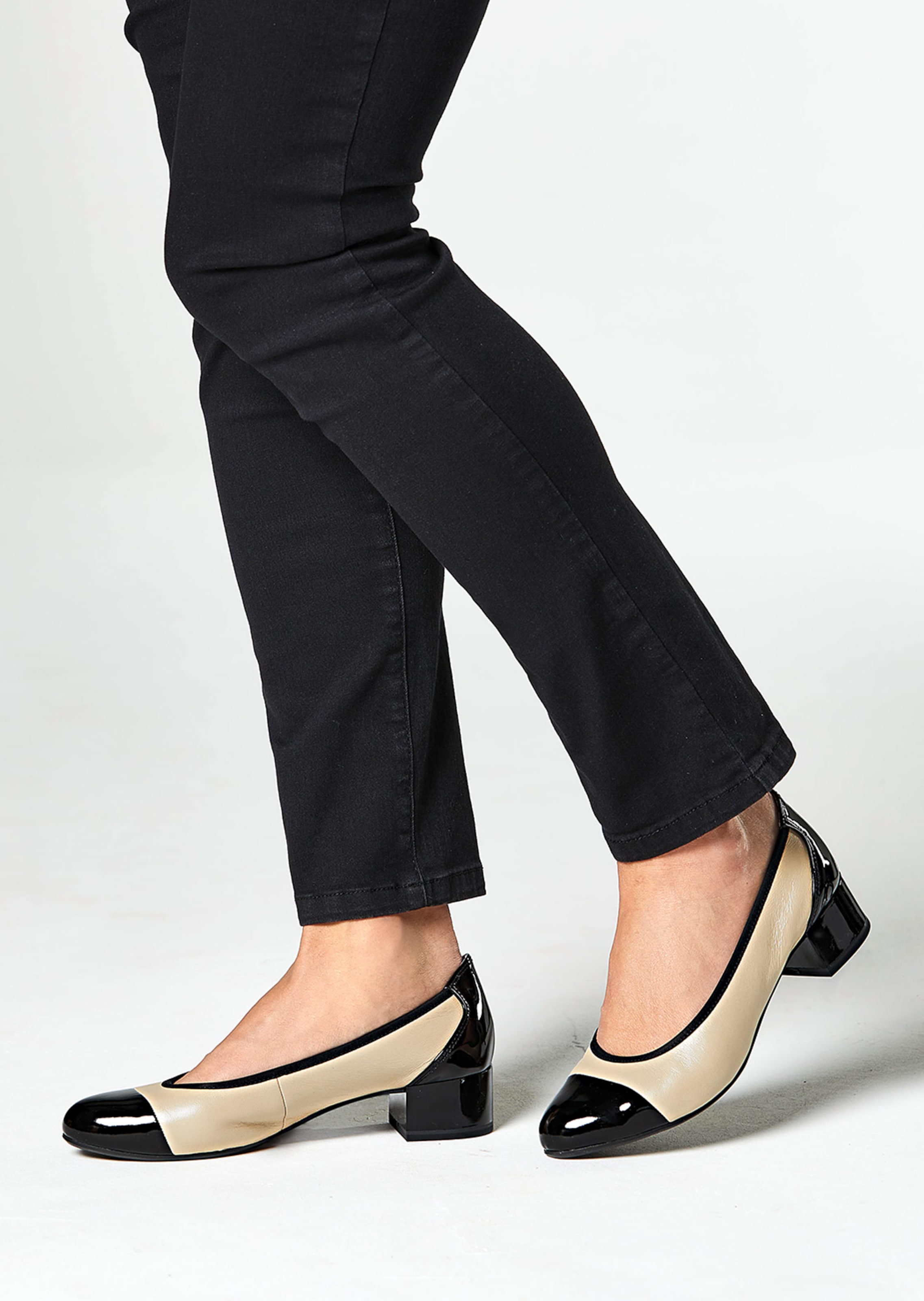 Pumps van CAPRICE in een elegante, tweekleurige look met accenten van lakleer. De hakdemping ontlast wervelkolom en gewrichten en zorgt zo voor optimaal comfort. Onderhoudsarm bovenwerk met leer. Gevoerd en voorzien van een leren binnenzool. Lichte loopzool met comfortabele blokhak.
