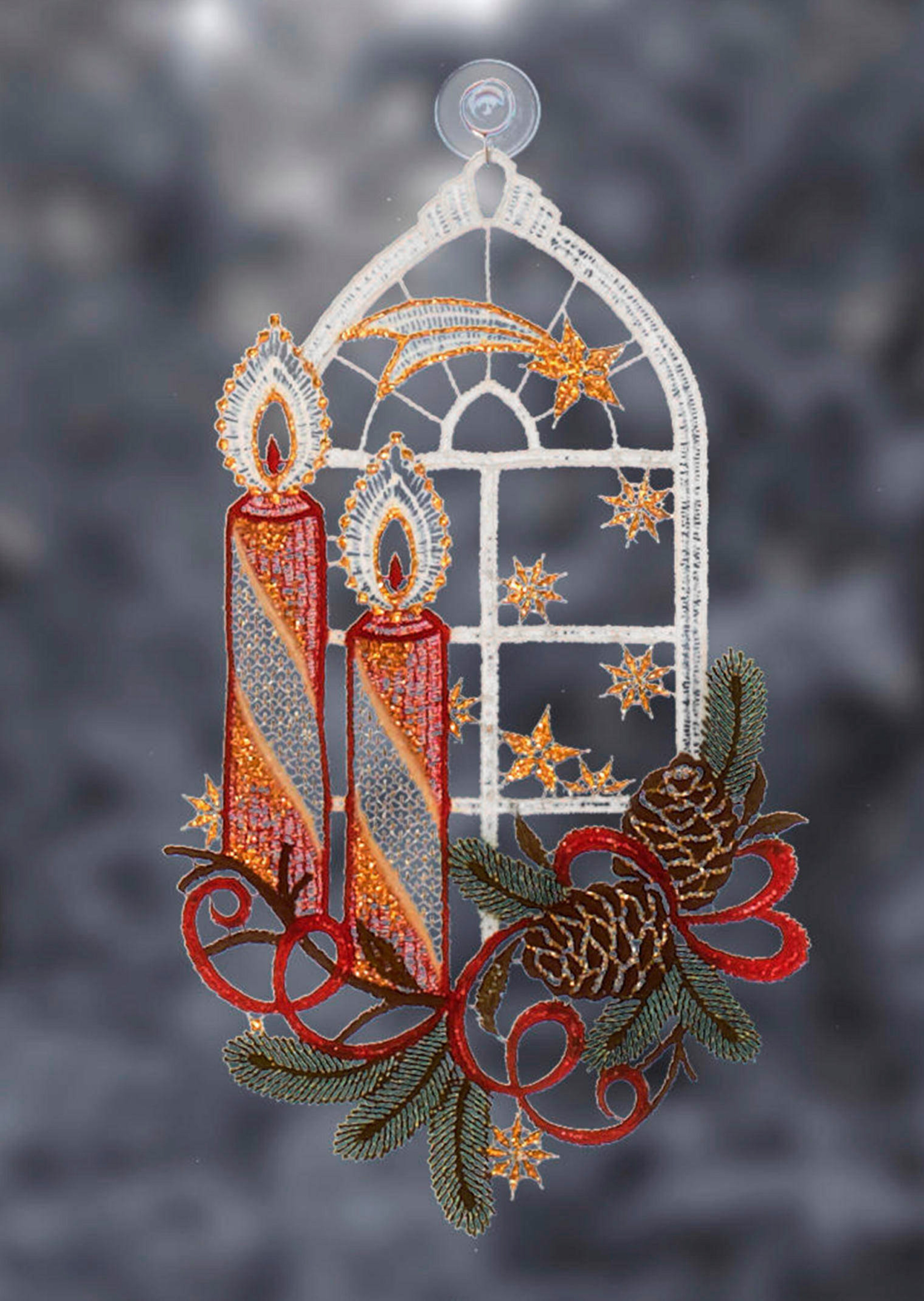 Raamdecoratie 'Kaarsen met dennenappels' van RAEBEL. Met dit hoogwaardige kunstwerk van echt Plauens borduursel kan de kerstperiode beginnen. Duits fabricaat met zeer veel oog voor detail. Voorzien van zuignap met haakje voor eenvoudige bevestiging.