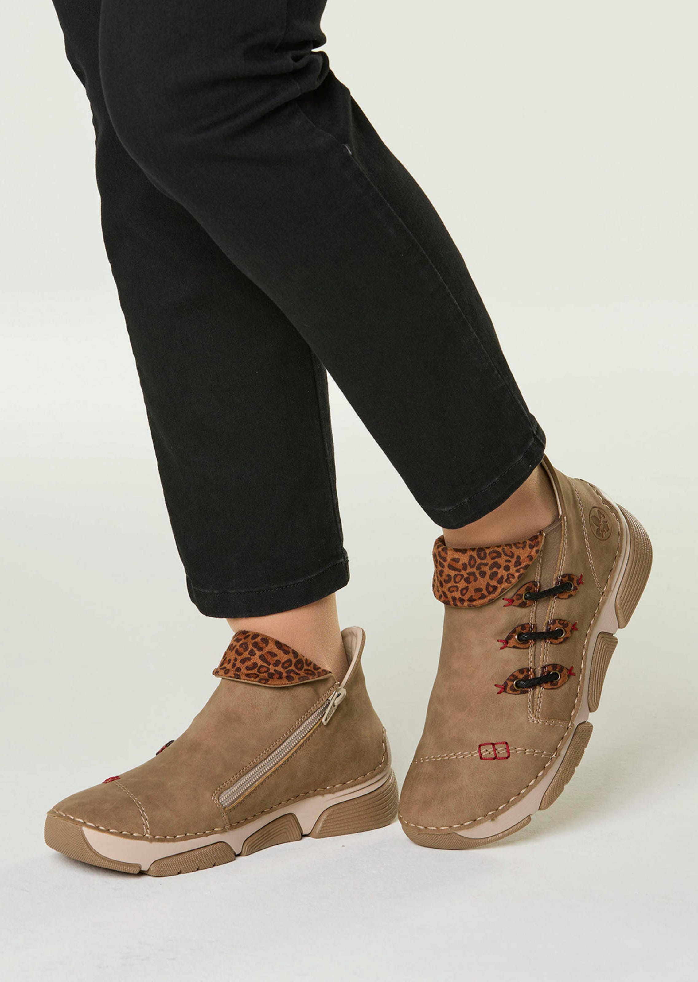 Laarsjes van RIEKER met sierdetails met luipaardprint en handstiksel-look. Gemakkelijk aan te trekken dankzij de ritssluiting en elastische inzetten. Bovenwerk van kunststof. Voering en binnenzool van textiel. Met innovatieve antistresstechnologie.