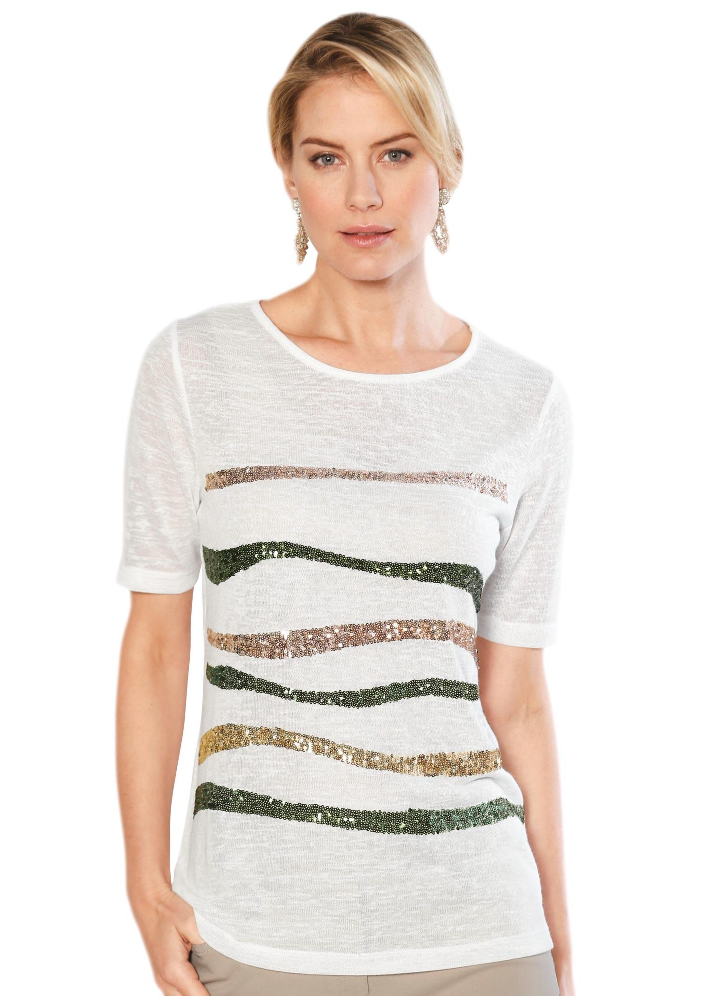 Shirt met opgestikte pailletten in vele aantrekkelijke kleuren. Afgewerkt van lichte etskant voor een bijzondere look met een vleugje transparantie. Daarnaast is dit shirt heel onderhoudsvriendelijk. Lengte ca. 64 cm in maat 46, ca. 60 cm in maat 23.