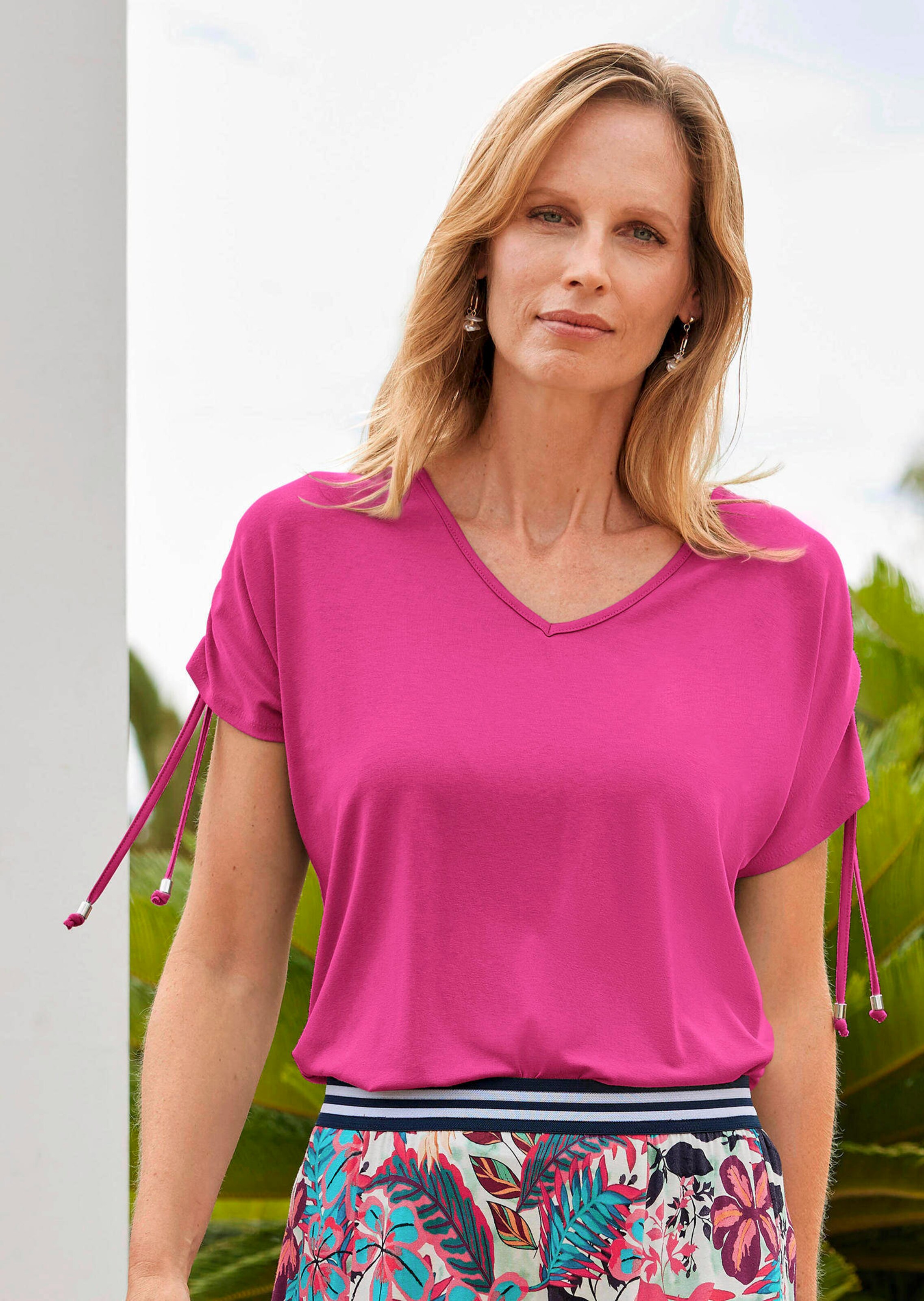 Shirt van zachte viscose-jersey dat veel indruk maakt met elegante details: de V-hals is hoogwaardig afgewerkt met een bies, accentueert het decolleté en laat u langer lijken. Dankzij het strikje bij de schouders kunt u de mouwen elegant aanrimpelen en de lengte variëren. Een mooie basic die uw outfit een vleugje raffinement geeft! Lengte ca. 64 cm in maat 46, ca. 60 cm in maat 23.