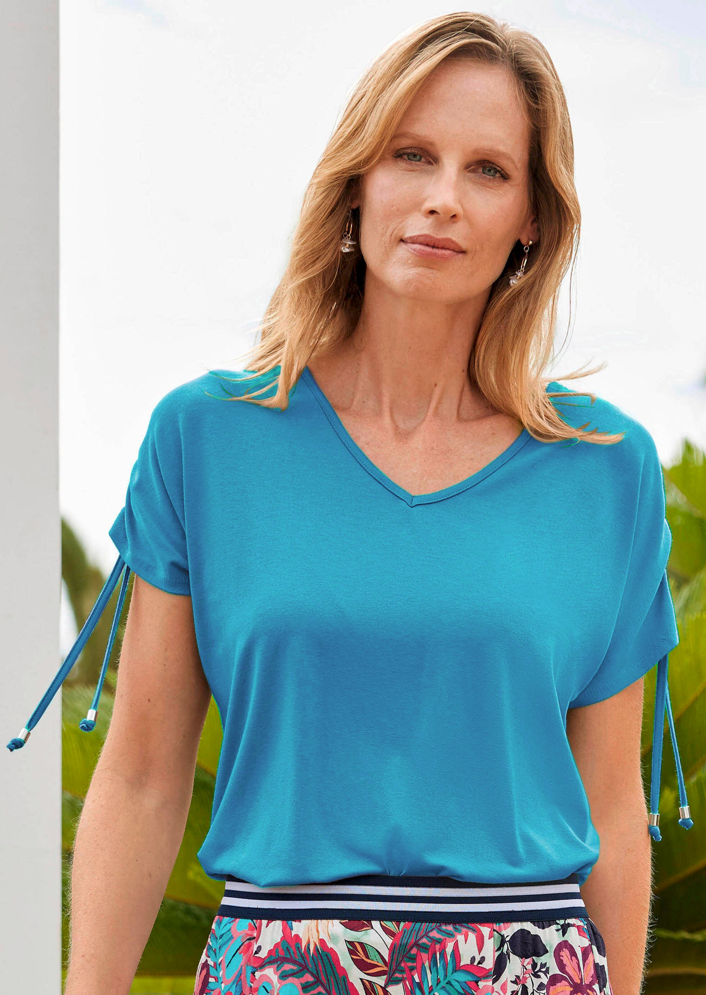 Shirt van zachte viscose-jersey dat veel indruk maakt met elegante details: de V-hals is hoogwaardig afgewerkt met een bies, accentueert het decolleté en laat u langer lijken. Dankzij het strikje bij de schouders kunt u de mouwen elegant aanrimpelen en de lengte variëren. Een mooie basic die uw outfit een vleugje raffinement geeft! Lengte ca. 64 cm in maat 46, ca. 60 cm in maat 23.
