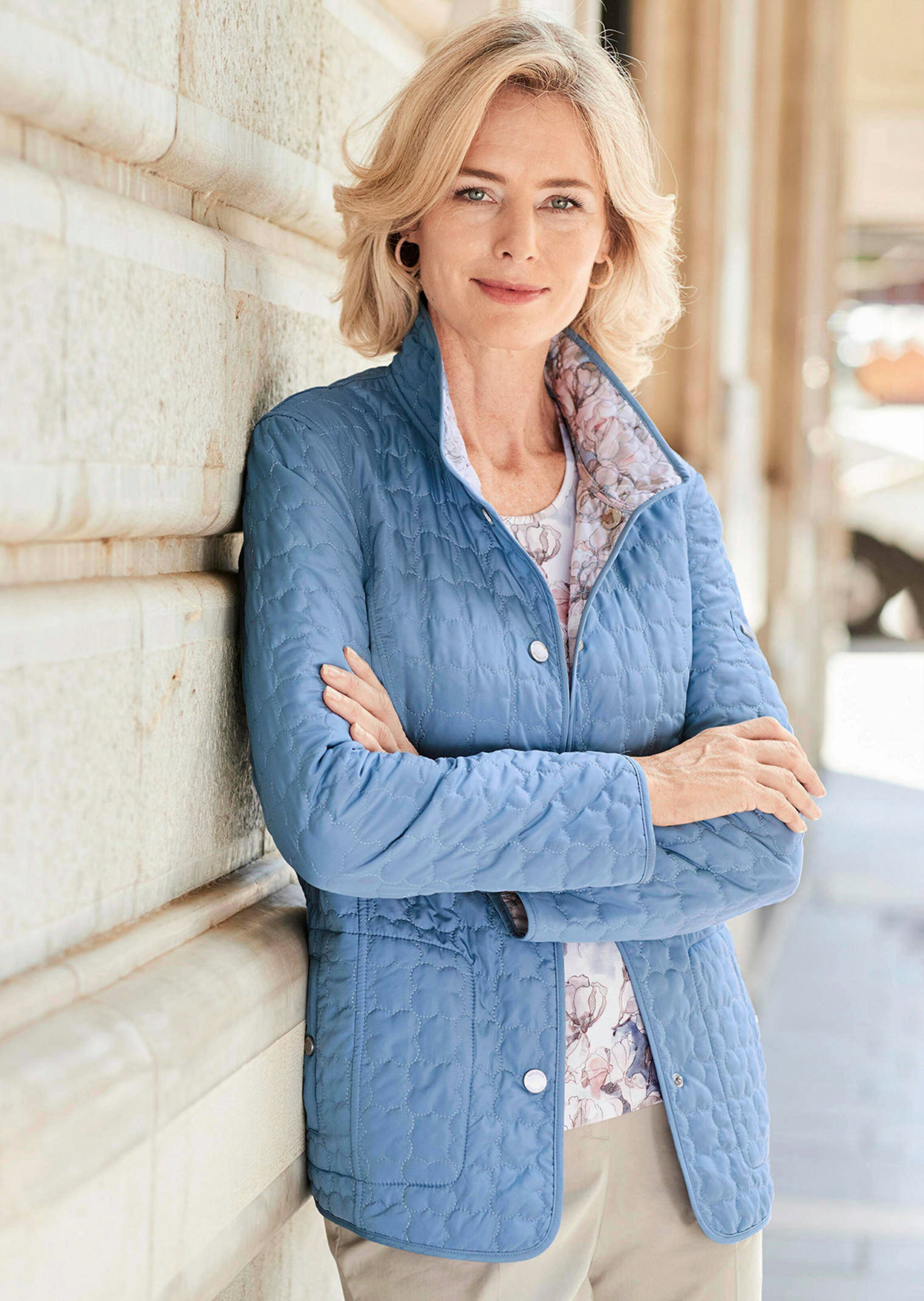 Keerbaar jack, dat met twee aantrekkelijke kanten charmeert. Licht glanzend effen of met bloemendessin biedt het u onvermoede combinatiemogelijkheden. Daarnaast maakt dit jack een uitstekende indruk door het interessante fantasiestiksel. Weense naden voor en achter zorgen voor een perfecte pasvorm. De kleine platte kraag kan ook als opstaande kraag worden gedragen. De drukknopen bij de sluiting en bij de zakken hebben het GOLDNER-opschrift. Lengte ca. 71 cm in maat 46, ca. 67 cm in maat 23.