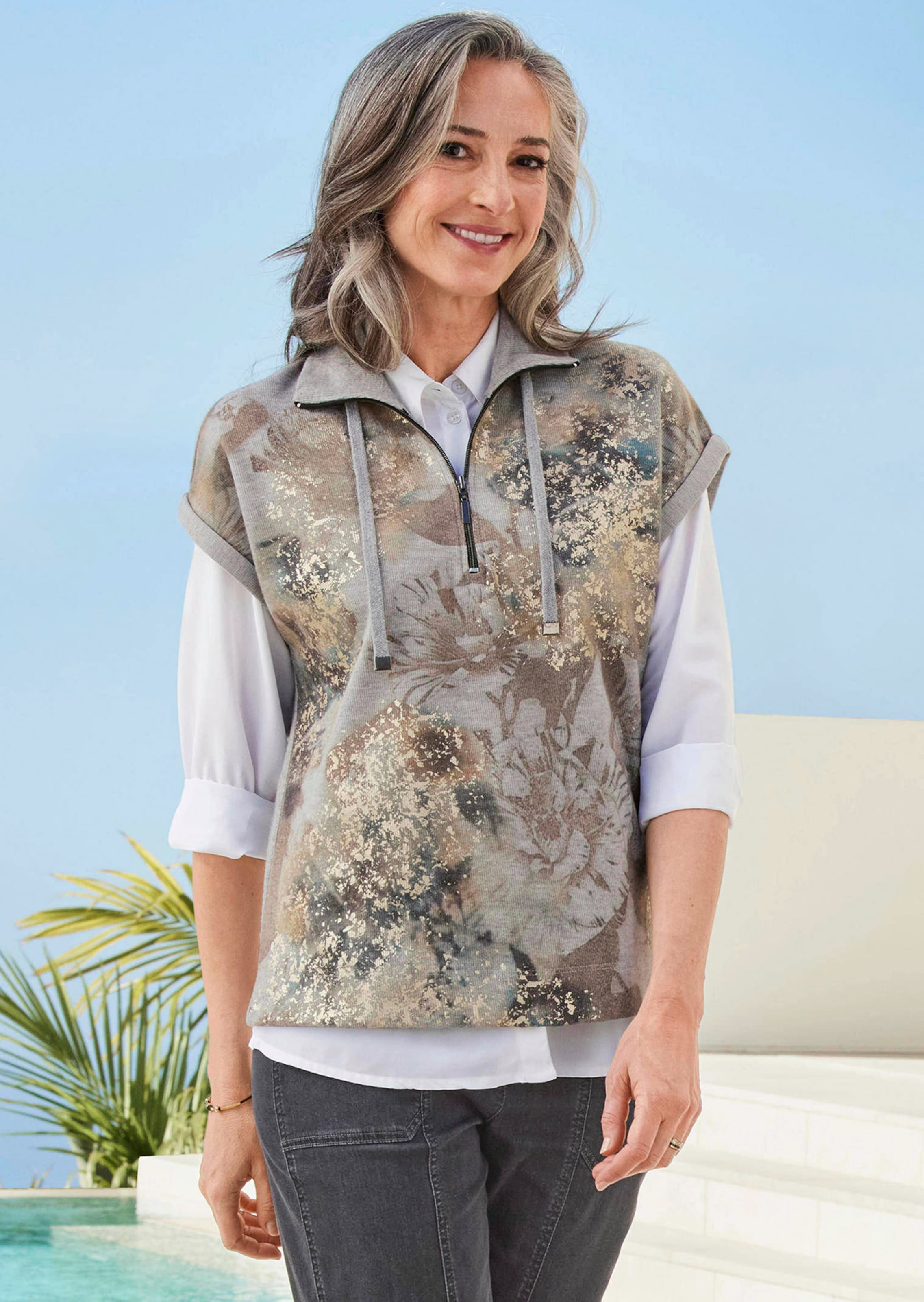 Sweatshirt dat snel tot uw favorieten zal behoren dankzij de zachte katoen-sweatstof en de frontprint met metallic accenten. In sportieve uitvoering met een opstaande kraag met ritssluiting die u plat kunt leggen en ton sur ton koordbandje met metalen uiteinden. Modieus aangeknipte mouwen, armsgat met kleine omslag. Ruimvallend model met zijnaadsplitten. Lengte ca. 66 cm in maat 46, ca. 62 cm in maat 23.