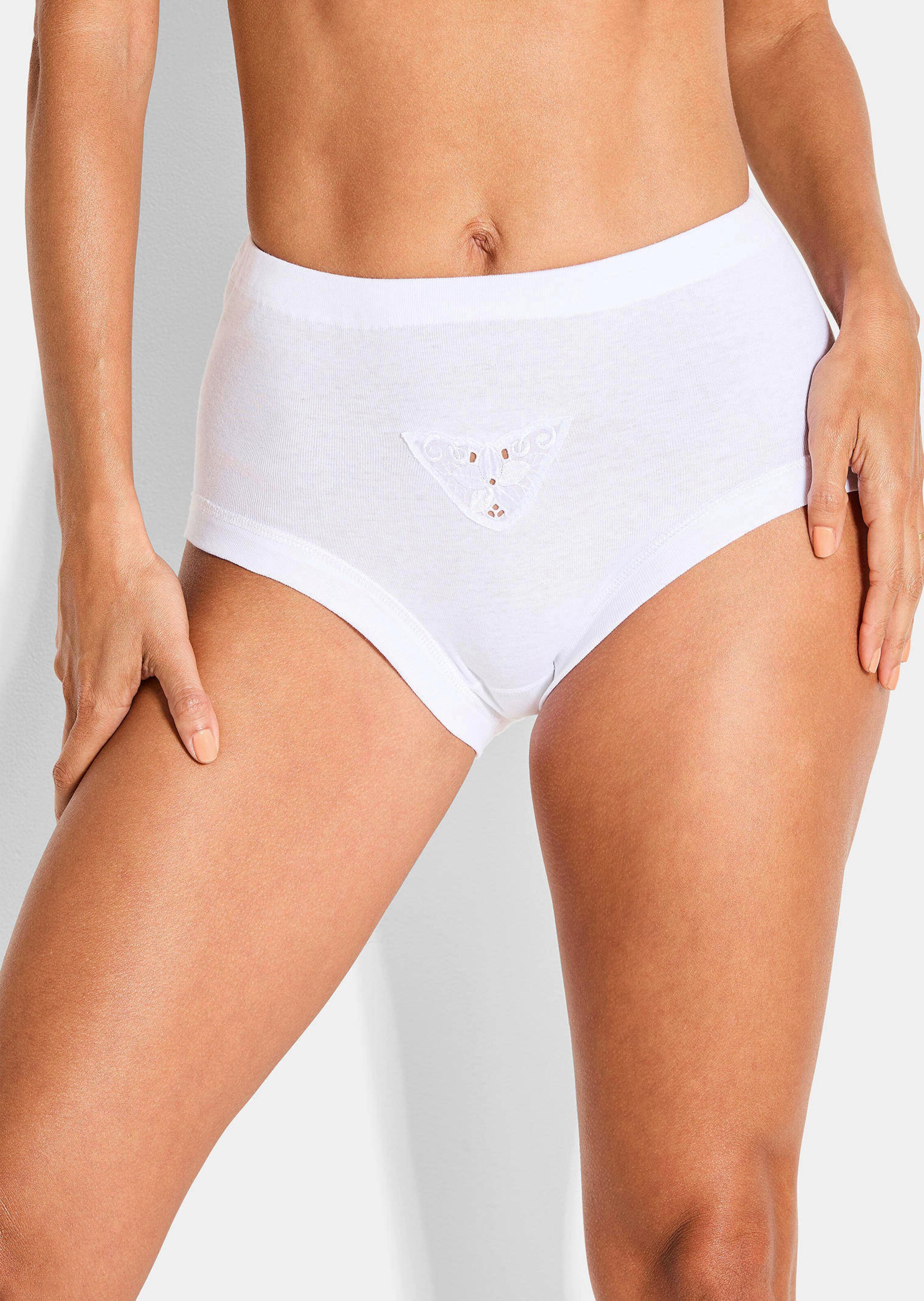 Drie tailleslips van GÖTTING met motiefkant voor. Zuiver, supergekamd katoen. Verwisselbare elastische tailleband en brede, bijzonder elastische rand langs de beenlijn. Katoenen kruisje.