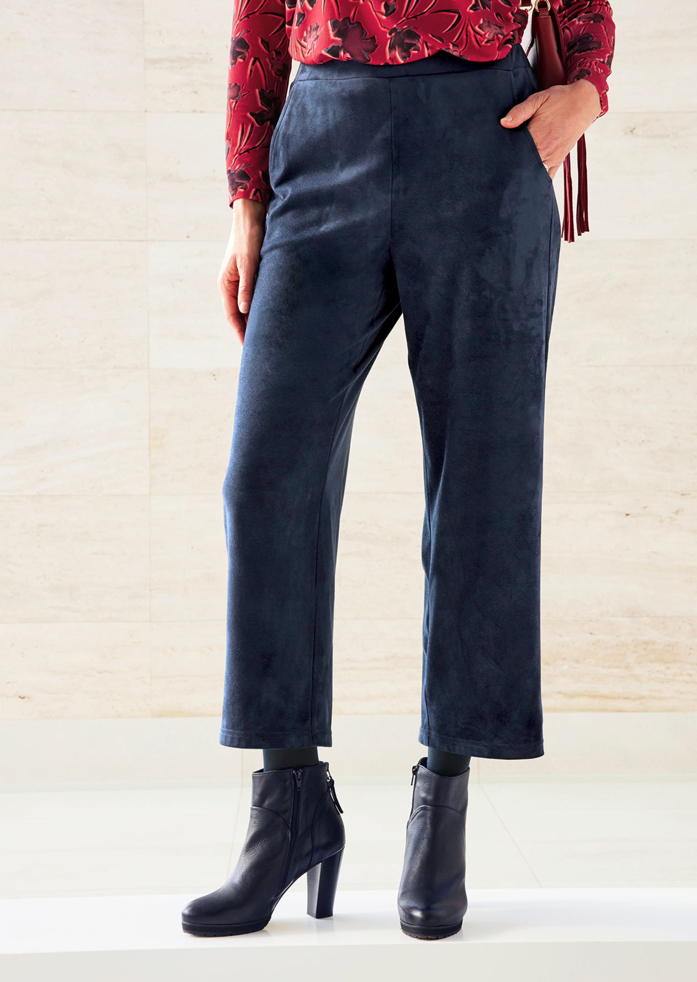 Culotte – een onweerstaanbare keuze als het om trendy looks gaat. Voel het ongelooflijk zachte materiaal in suèdelook: zo onbeschrijfelijk zacht en absoluut onderhoudsarm. Modieus afgewerkt met wijde pijpen in verkorte lengte. De elastische tailleband en de steekzakken completeren de look. Voetwijdte ca. 56 cm. Wijde pijpen.