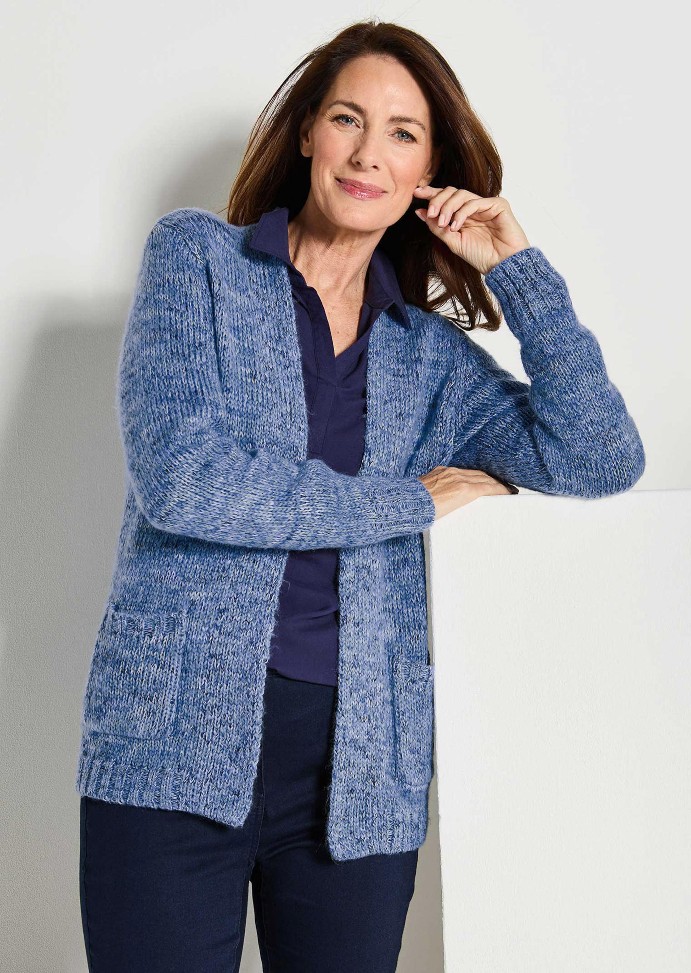 Tricot jasje in een cardiganmodel zonder sluiting. Het zachte, warme tricot van onderhoudsarm, gemêleerd garen biedt weldadig draagcomfort! De brede, plat aangebreide bies ligt zacht tegen de hals en is achter met een tricot strook aan de binnenkant verstevigd – blijft mooi in model en gaat lang mee. Lange mouwen, met een ribboord aan alle zomen. Opgestikte zakken met ribstrook. Lengte ca. 67 cm in maat 46, ca. 63 cm in maat 23.