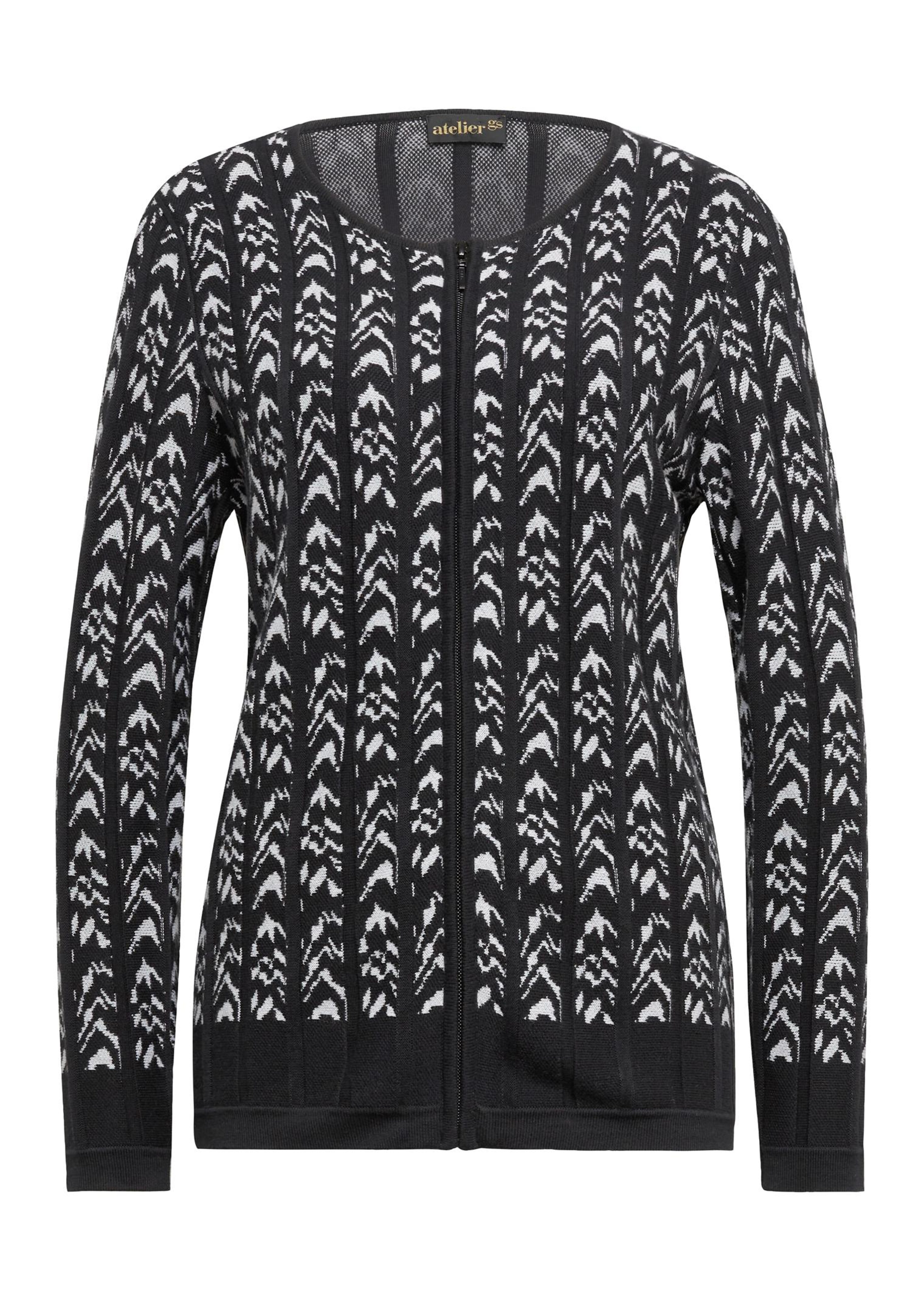 Tricot jasje met grafisch jacquardmotief in een sublieme uitvoering. Door de klassieke kleurencompositie kan het jasje veelzijdig worden gecombineerd en is het comfortabel dankzij het zomerse materiaal. Met ronde hals, praktische ritssluiting en aangenaam gladde boorden. Lengte ca. 65 cm in maat 46, ca. 61 cm in maat 23.