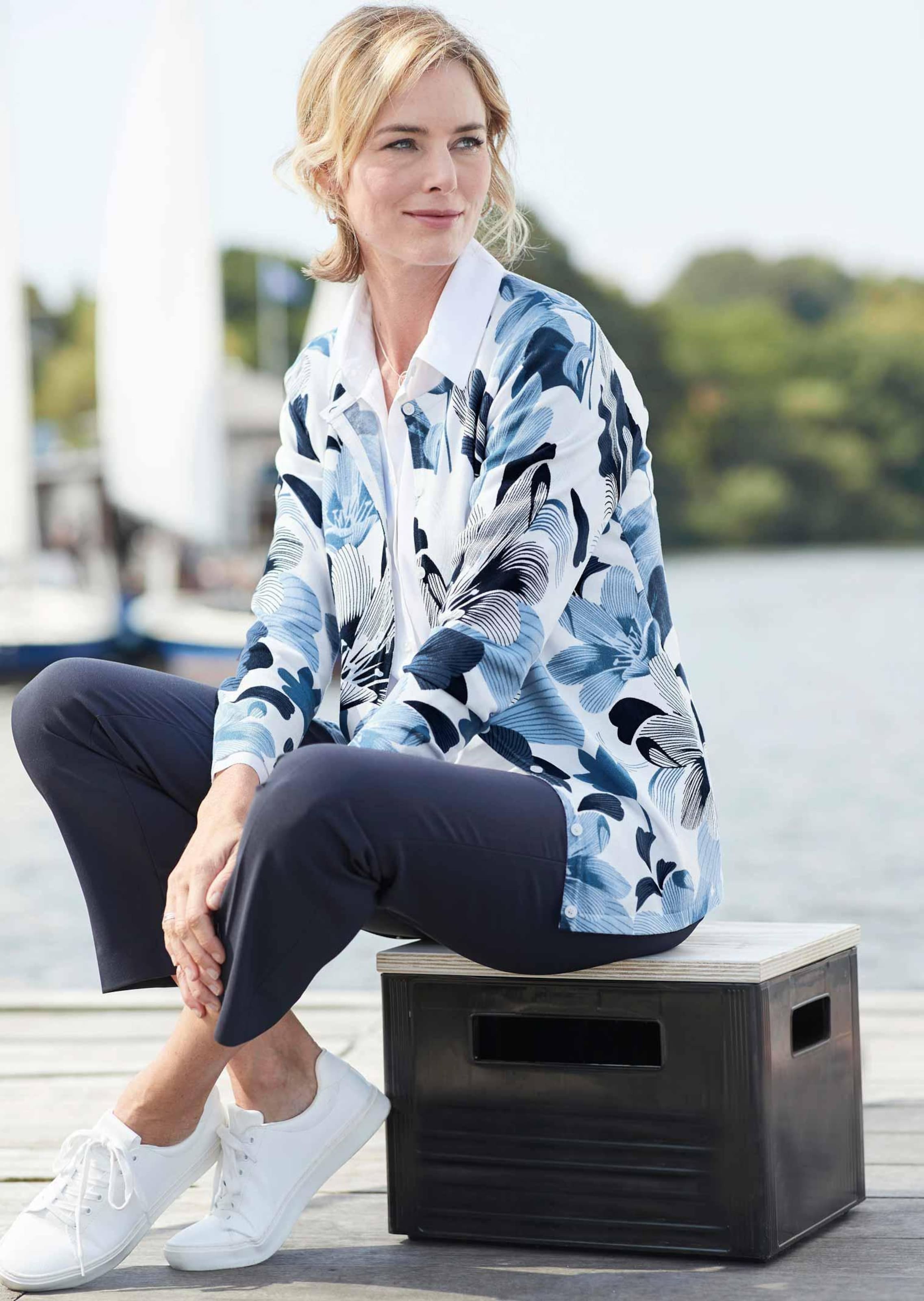Gedessineerd tricot jasje, dat expressief rondom is gedessineerd met bloemen in blauwtinten. Het jasje is doorgeknoopt en heeft een ronde hals en lange mouwen. Aangename en huidvriendelijke viscosemix met gladde randen. Lengte ca. 71 cm in maat 46, ca. 67 cm in maat 23.