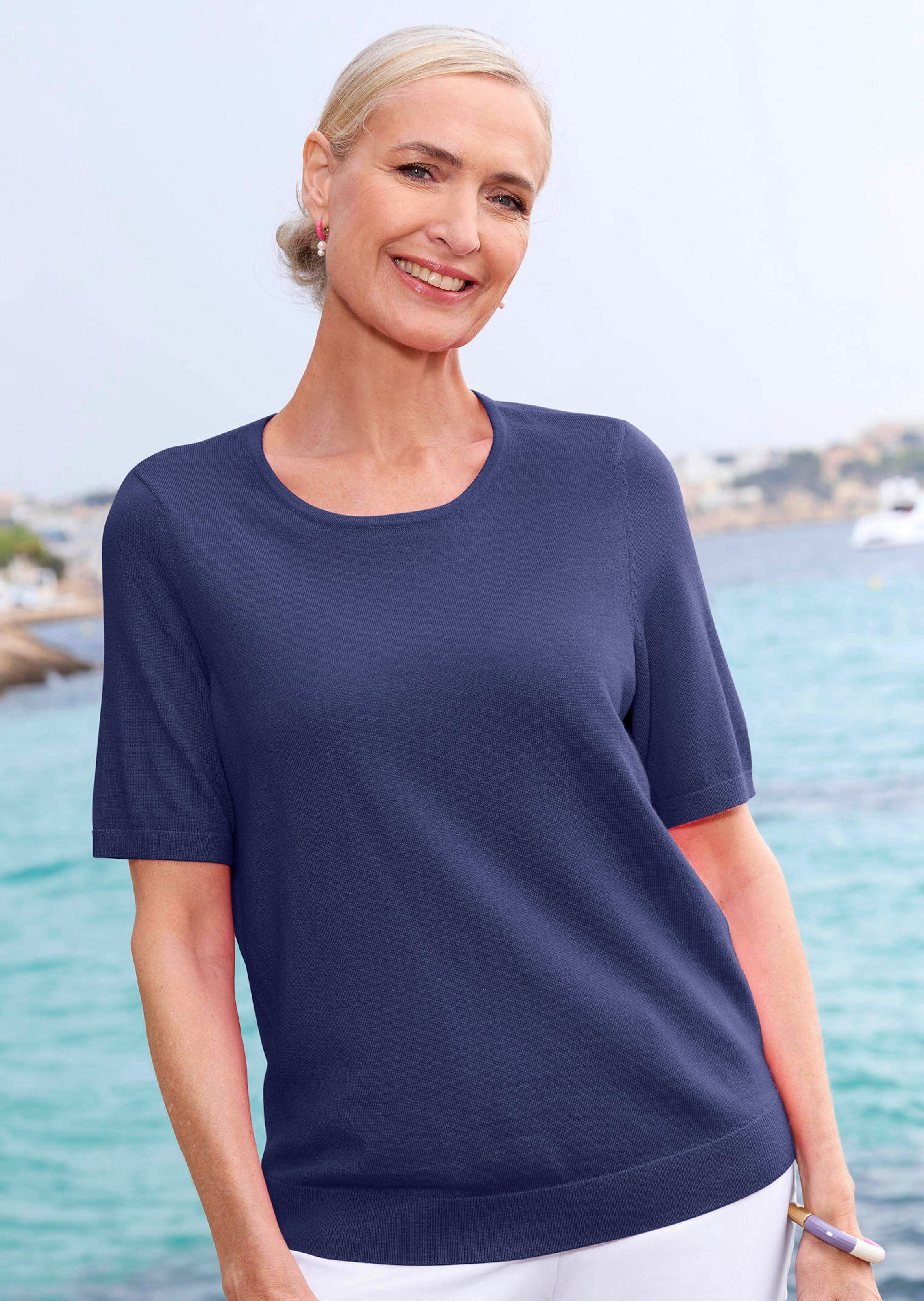 Tricot pullover van behaaglijk zachte merinowol – klassieke pasvorm met korte mouwen en ribboorden bij de zomen. De ronde hals heeft een platte, smalle bies. Bijzonder aangenaam is het hoogwaardige materiaal met temperatuurregulerende eigenschappen. Afzonderlijk of elegant in een twinset – met deze tricot pullover bent u altijd goed gekleed! Lengte ca. 63 cm in maat 46, ca. 59 cm in maat 23.