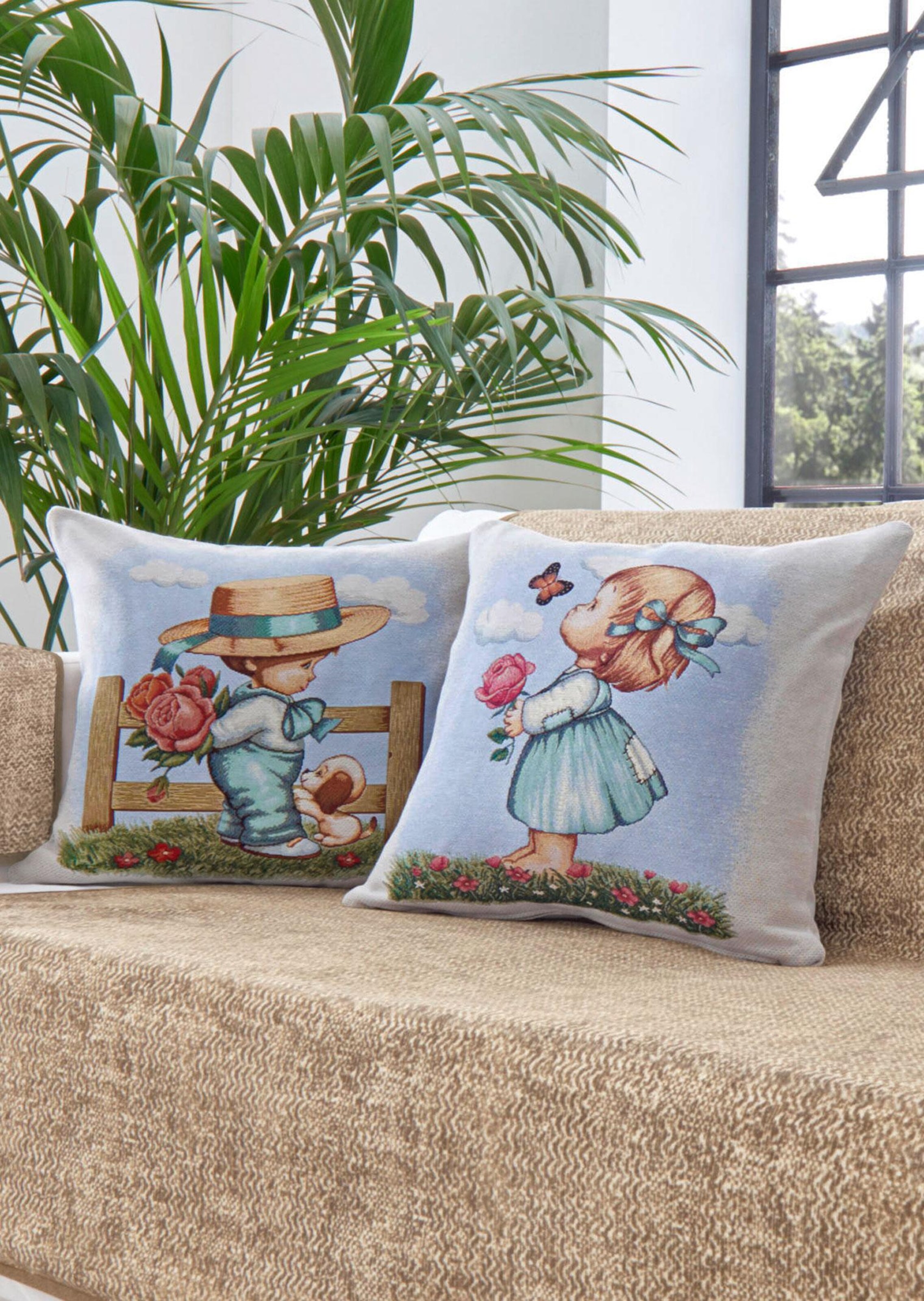 Twee kussenhoezen van HOSSNER SEASONS. De decoratieve kussenhoezen van onderhoudsarm materiaal in linnenlook en met schattige kinderen voor en achter zijn een absolute blikvanger. Voorzien van een ritssluiting om eenvoudig om het kussen te doen.