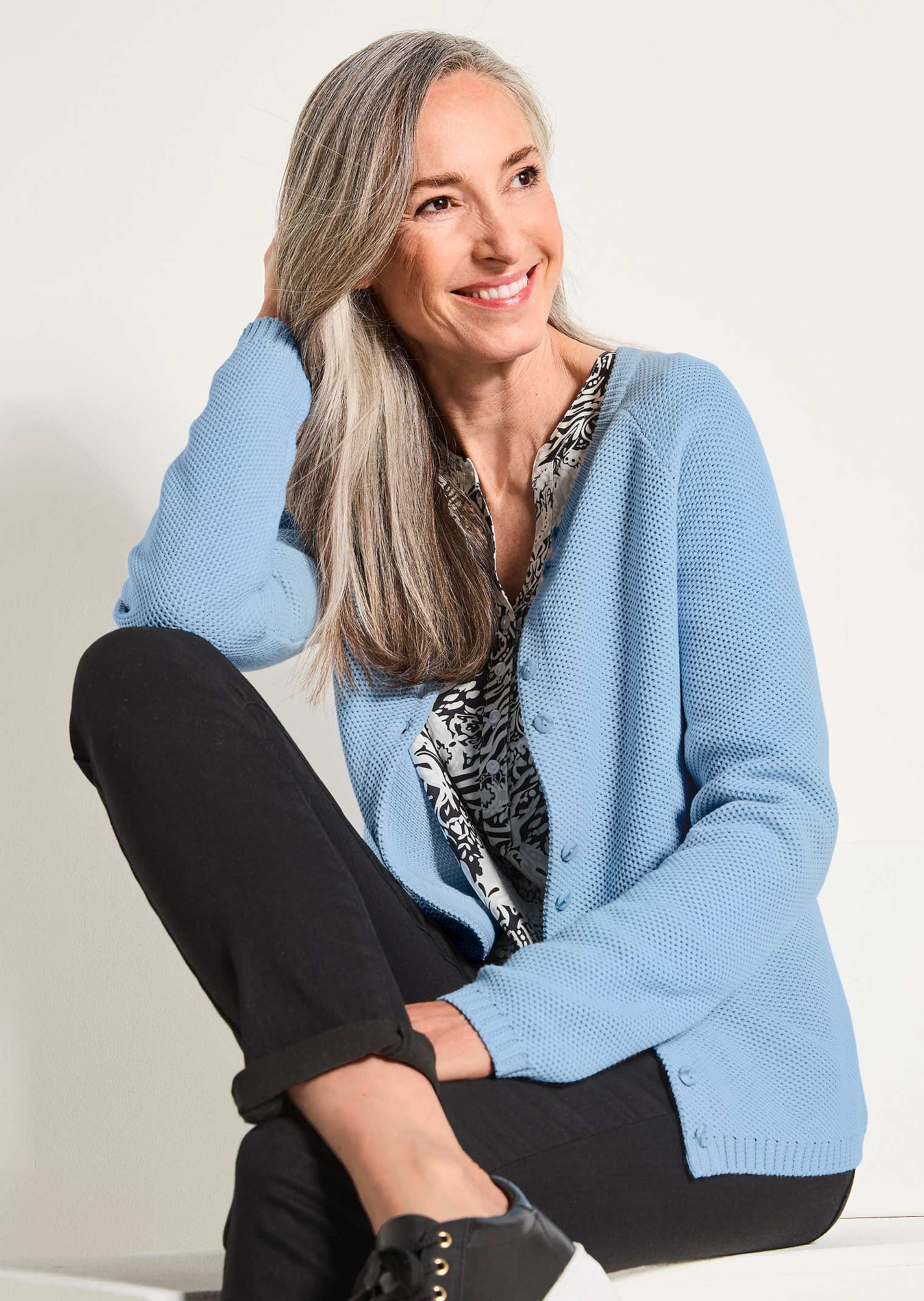 Tricot jasje van puur katoen. Het structuuroppervlak in piquélook geeft dit effen model een aantrekkelijk accent. Klassieke pasvorm met lange mouwen, een ronde hals met ribboordje en smalle ribboorden bij de zomen. De knoopsluiting is met een tricot strook tegengevoerd, de paarsgewijs gerangschikte, harmonieuze knopen getuigen van een gedetailleerde afwerking. Lengte ca. 65 cm in maat 46, ca. 61 cm in maat 23.