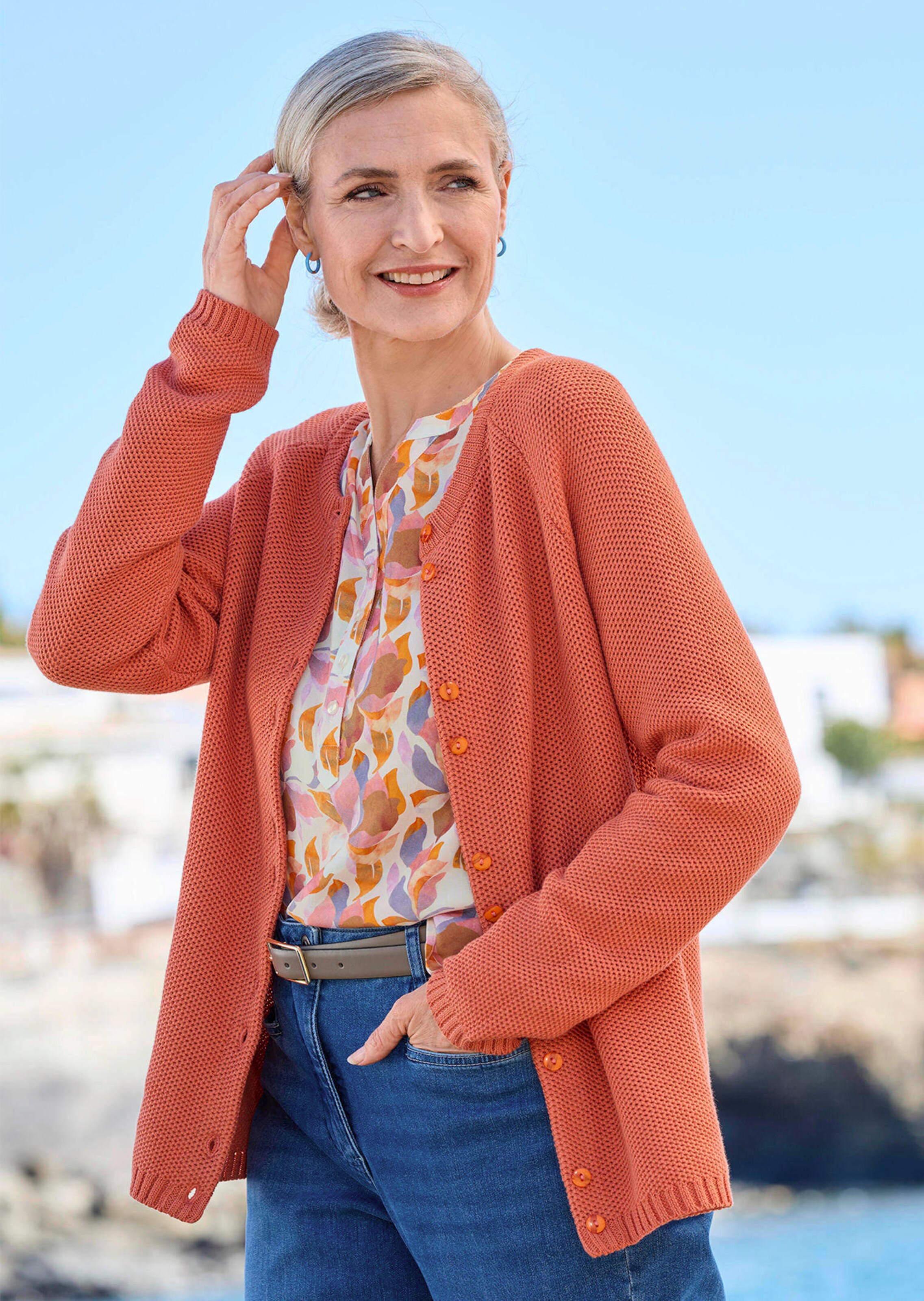Tricot jasje van puur katoen. Het structuuroppervlak in piquélook geeft dit effen model een aantrekkelijk accent. Klassieke pasvorm met lange mouwen, een ronde hals met ribboordje en smalle ribboorden bij de zomen. De knoopsluiting is met een tricot strook tegengevoerd, de paarsgewijs gerangschikte, harmonieuze knopen getuigen van een gedetailleerde afwerking. Lengte ca. 65 cm in maat 46, ca. 61 cm in maat 23.