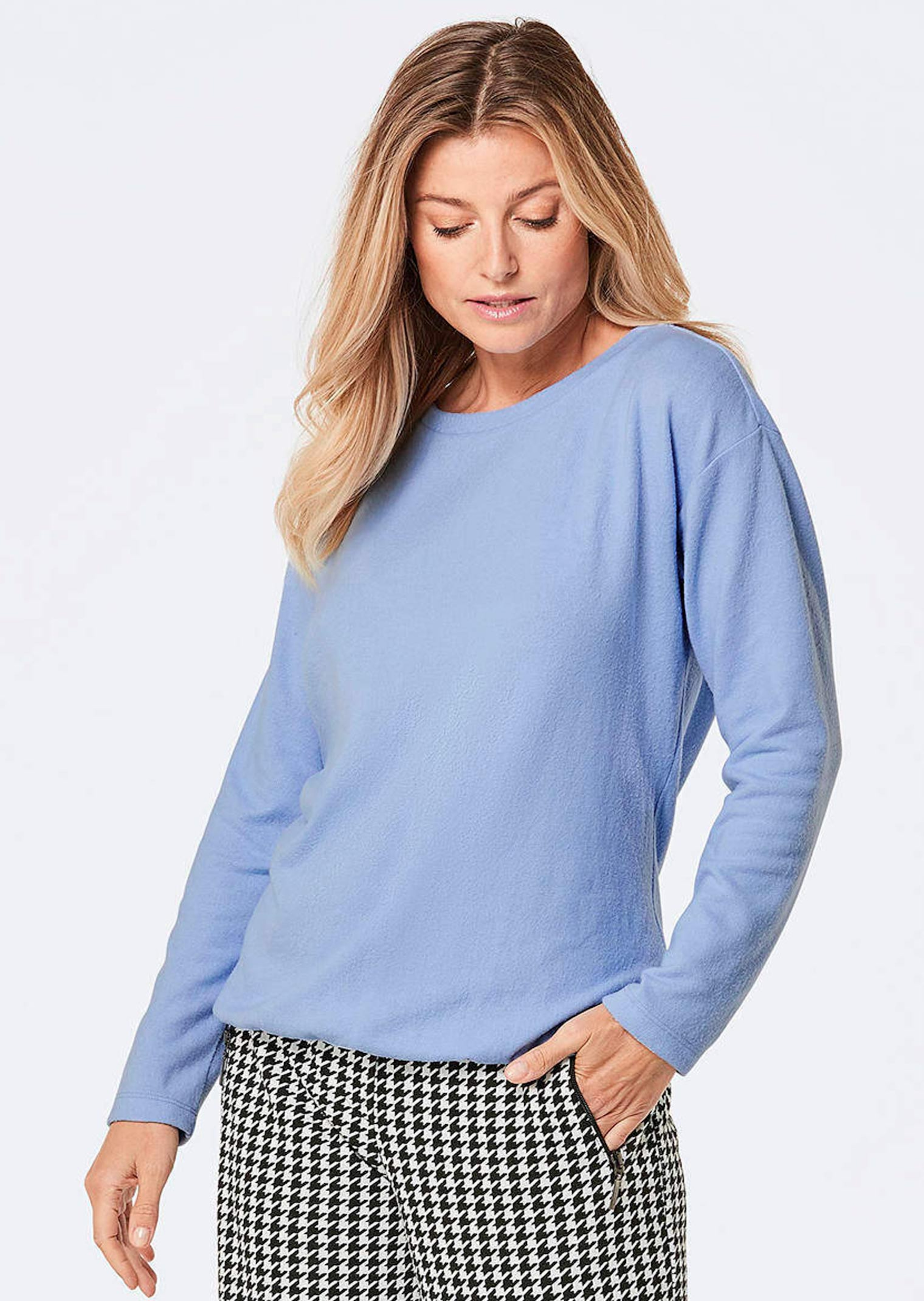 Shirt van zacht, onderhoudsarm materiaal, dat heerlijk warm is op een koude dag. Dankzij het casual model en het elastiek in de zoom is de lengte naar wens aan te passen. Lange mouwen en een elegante boothals maken het shirt helemaal af. Lengte ca. 66 cm in maat 46, ca. 62 cm in maat 23.